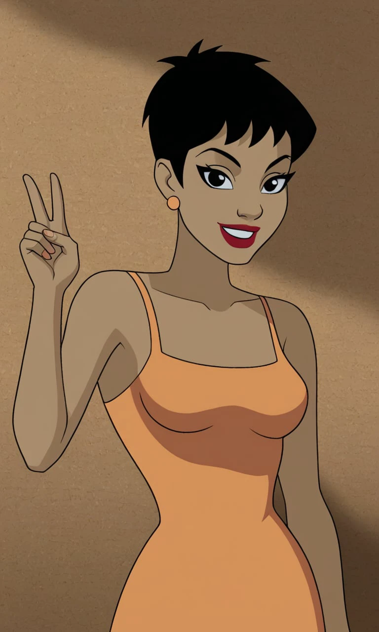 Kathy from Mystery of Batwoman movie, weight 0.8-0.9 trigger, Kathy,1girl,solo,black hair,short hair,black eyes,red lips, dark skin, dark-skinned female, orange dress, medium breasts, sleeveless dress, medium breasts you can also try lora online on here https://tensor.art/models/773799617763639402/Kathy-V.1
