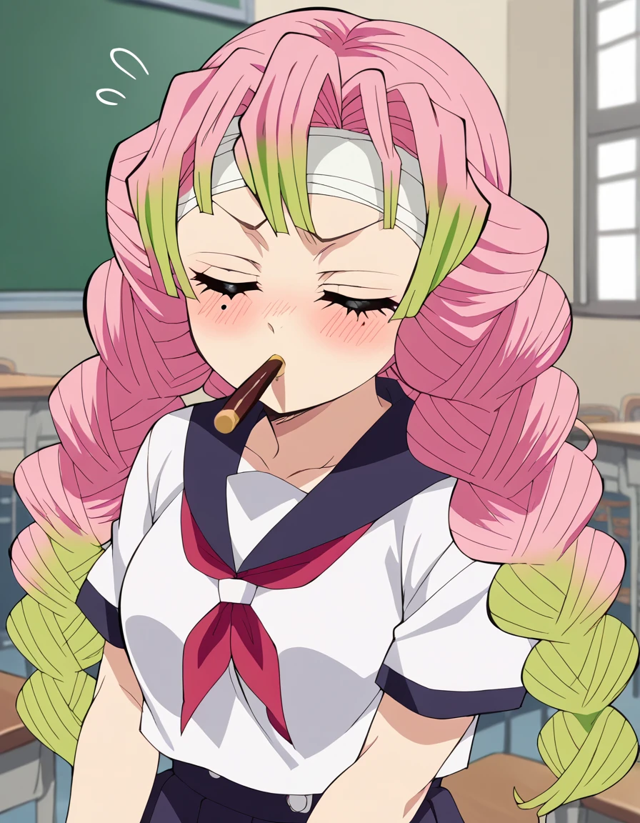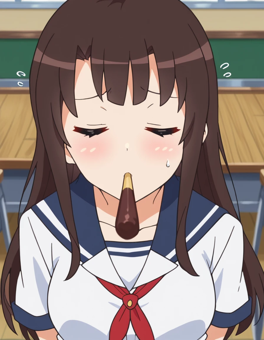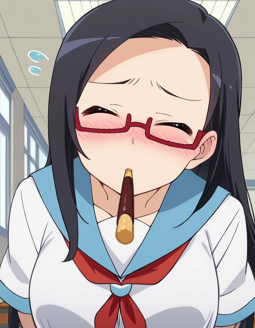 <lora:incoming-pocky-kiss-ponyxl-lora-nochekaiser:1>, incoming pocky kiss, looking at viewer, blush, food, mouth hold, flying sweatdrops, pocky, closed eyes, foreshortening