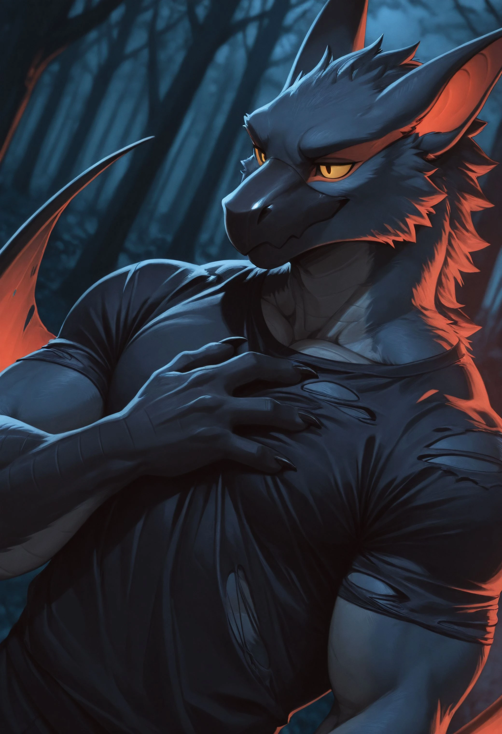 Illustrious: best quality, amazing quality, very aesthetic, absurdres, hires, n4rg4cug4, solo, 1boy, furry male, furry, flying wyvern, bara, claws, membrane wings, seductive, shorts, topless, upper body, ...your tags...Illustrious: bad quality, worst quality, bad anatomy, wrong anatomy, wrong limbs, broken anatomy, malformed limbs, artifacts, text, signature, watermark, patreon logoDescription