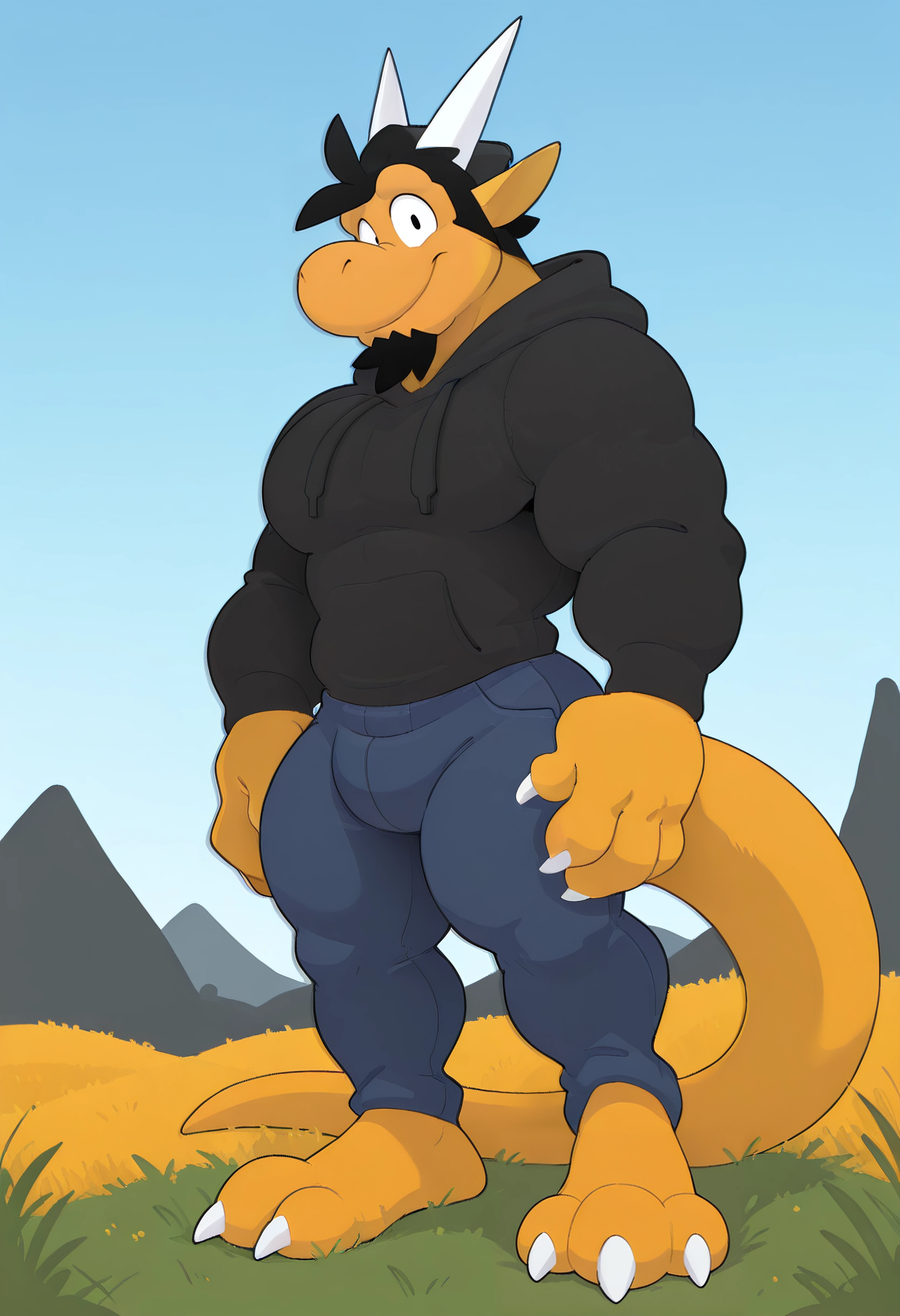 hikaze, solo, claws, muscular, tail, monster boy, horns, large pectorals, bara, thick thighs, furry, yellow skin, black hair,