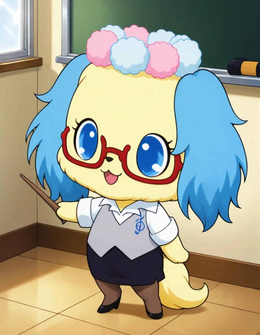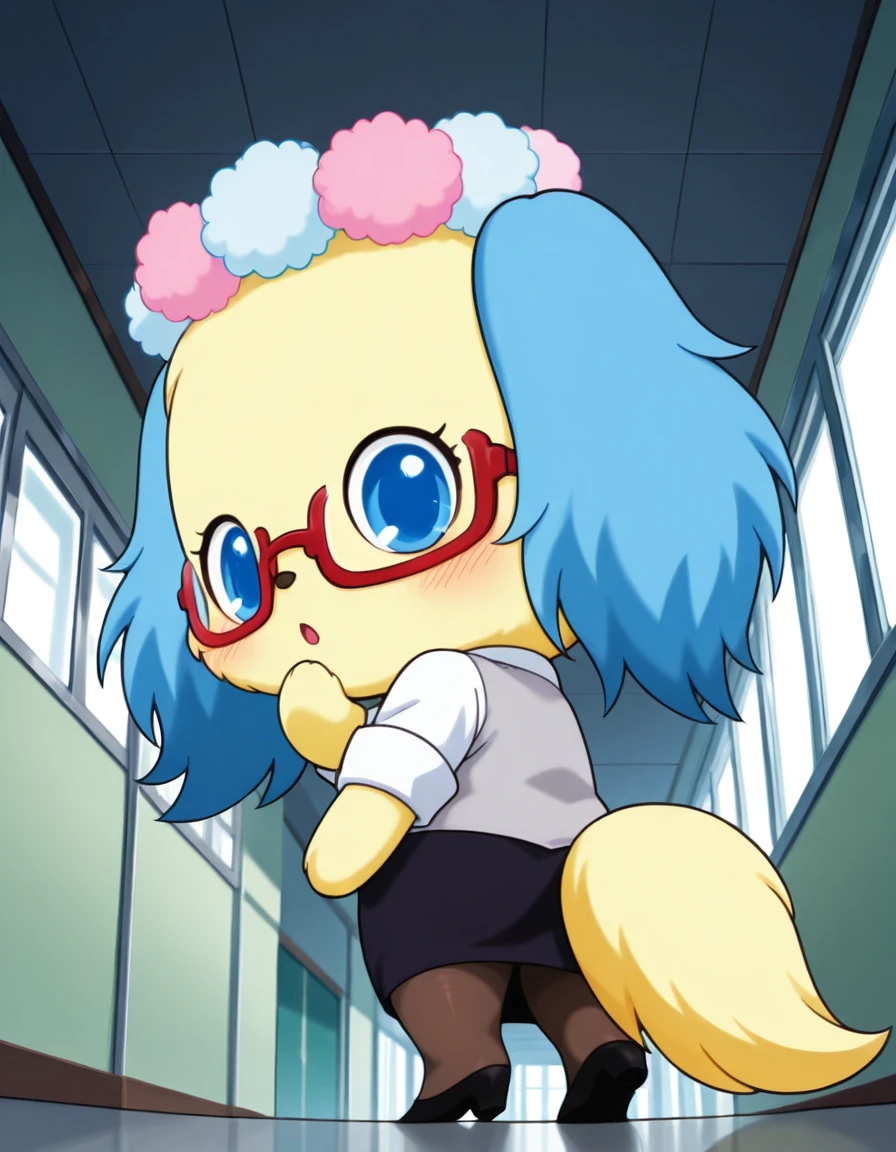 chibi, feral, yellow body, yellow face, (blue ears), yellow tail, flower crown, white shirt, grey cardigan, red glasses, black skirt, stockings, pumps,