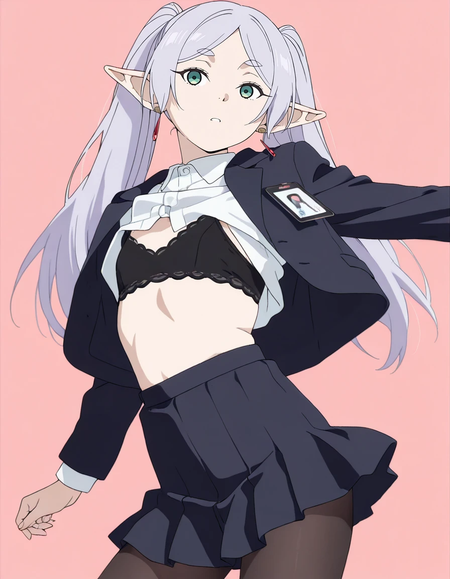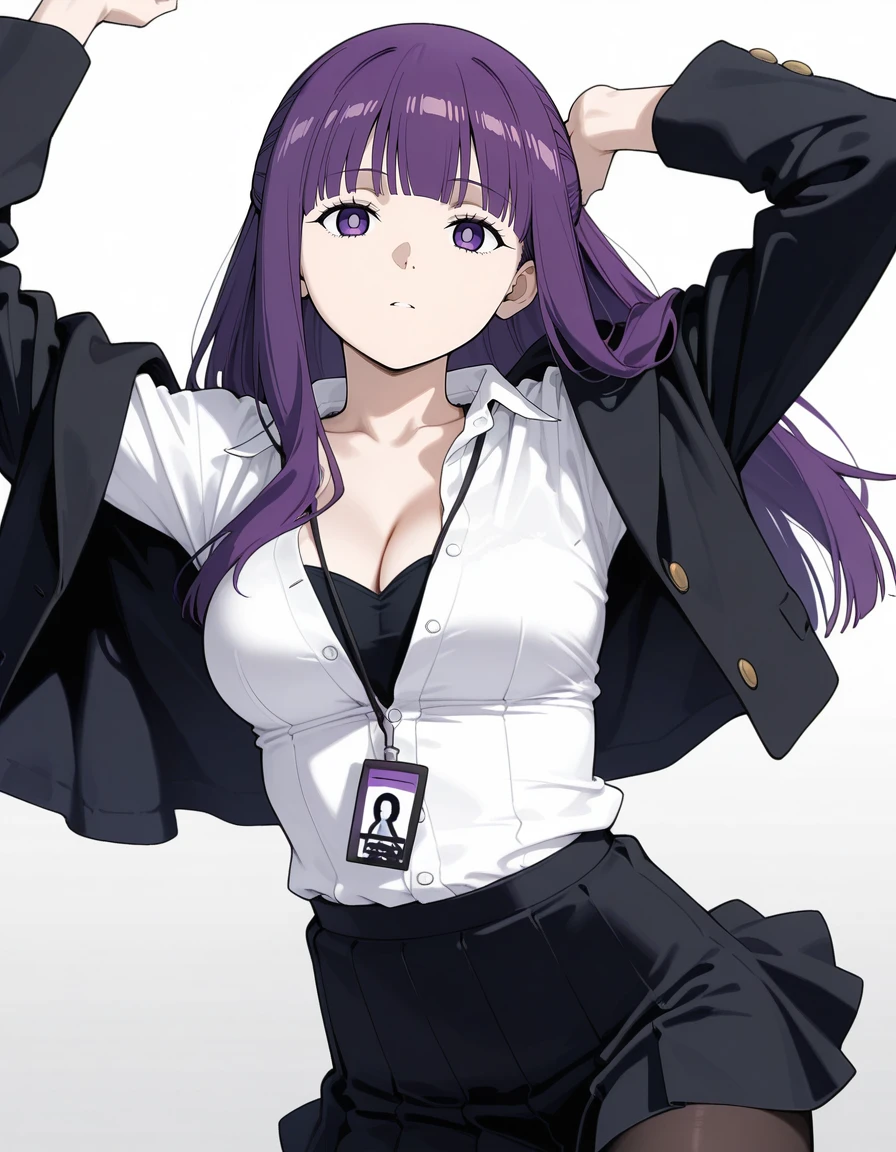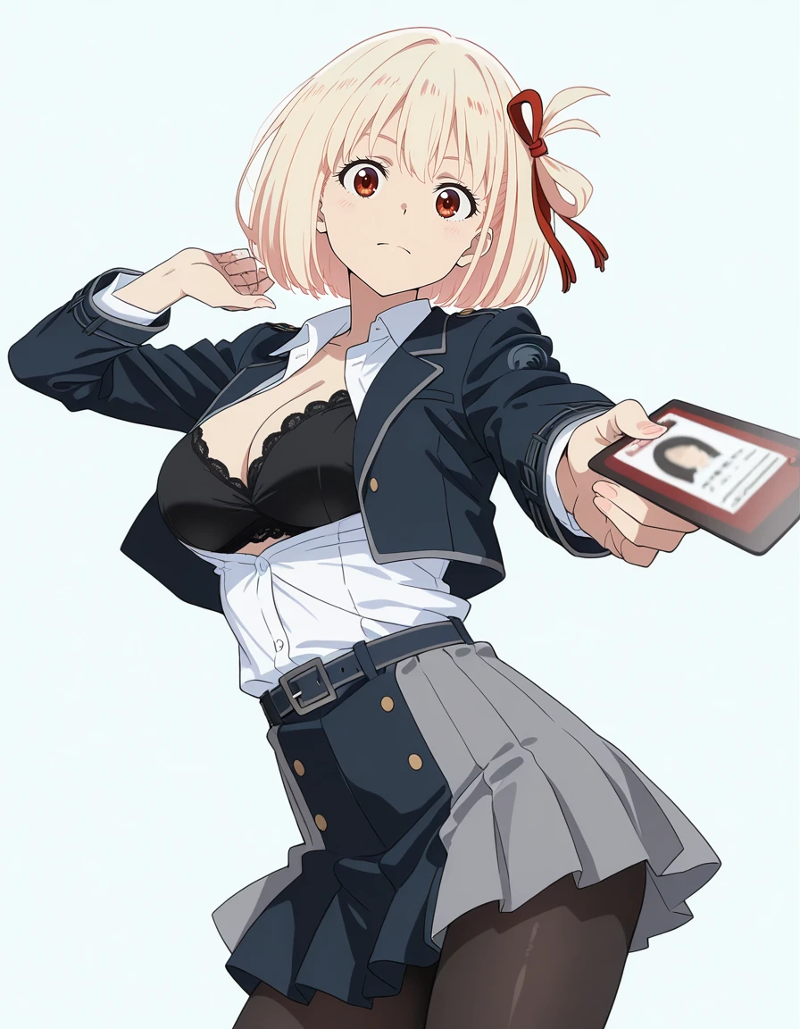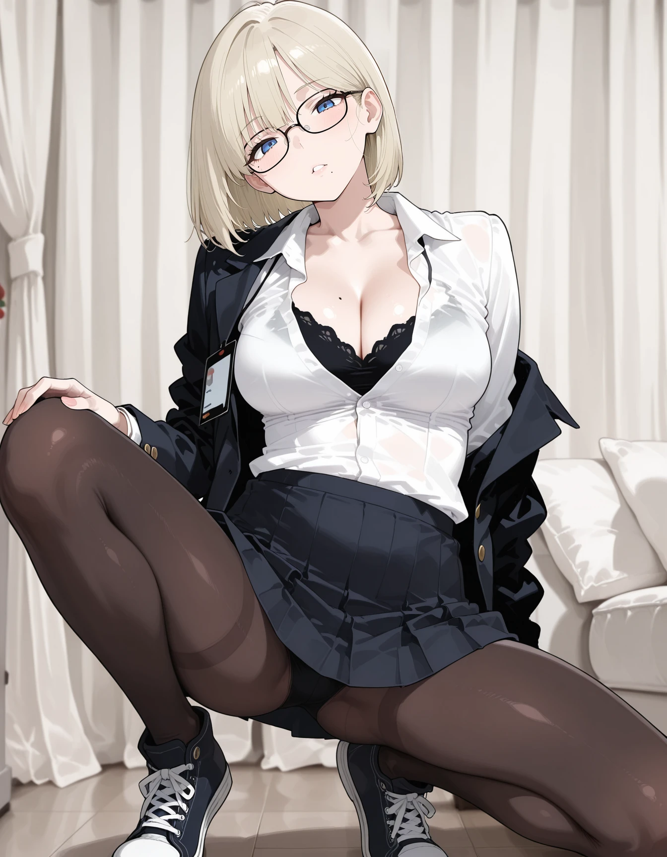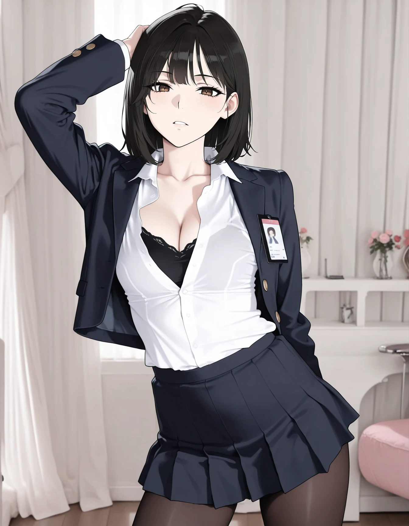 mai_bj_school_uniform,black_jacket,white_shirt,black_bra,skirt,black_pantyhose,id_card