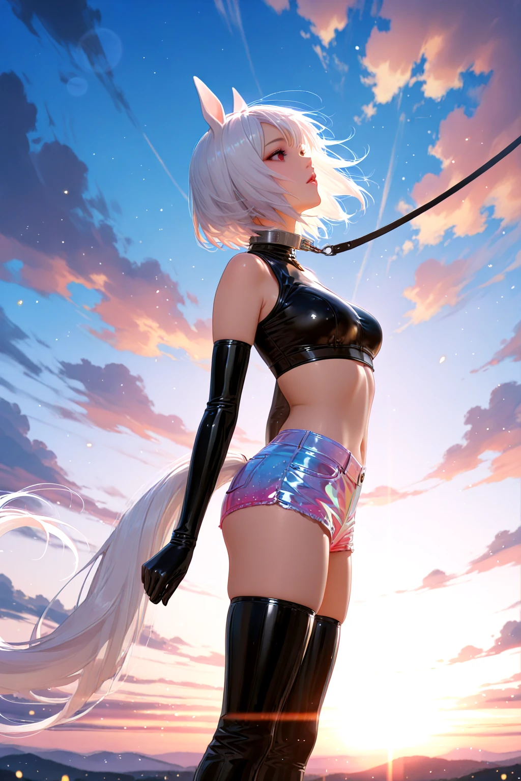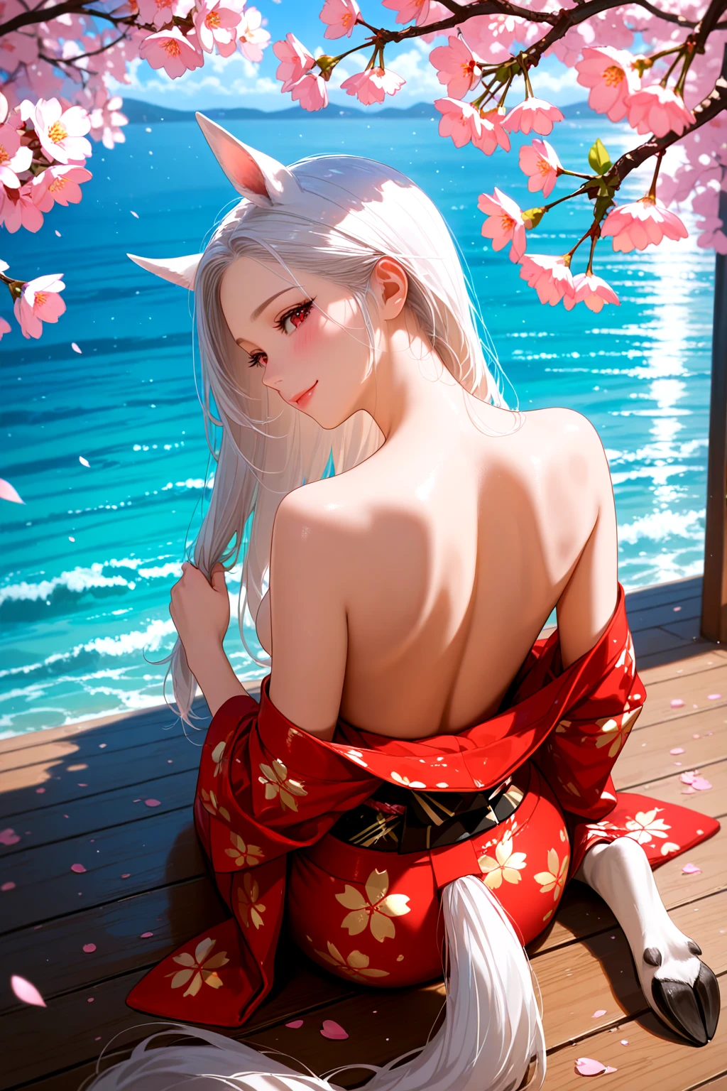 white horse-like ears, white horse-like tail, red eyes, white hair,