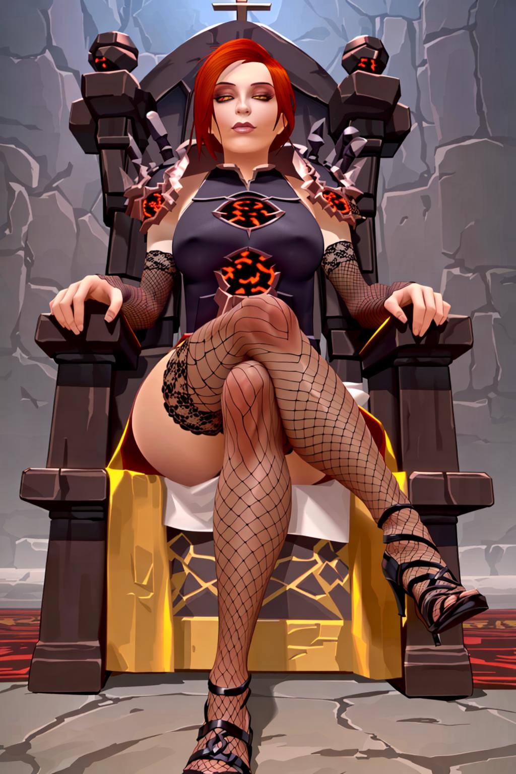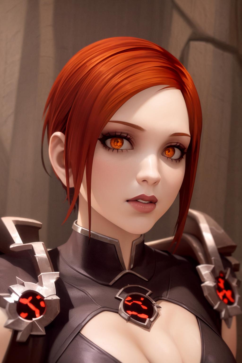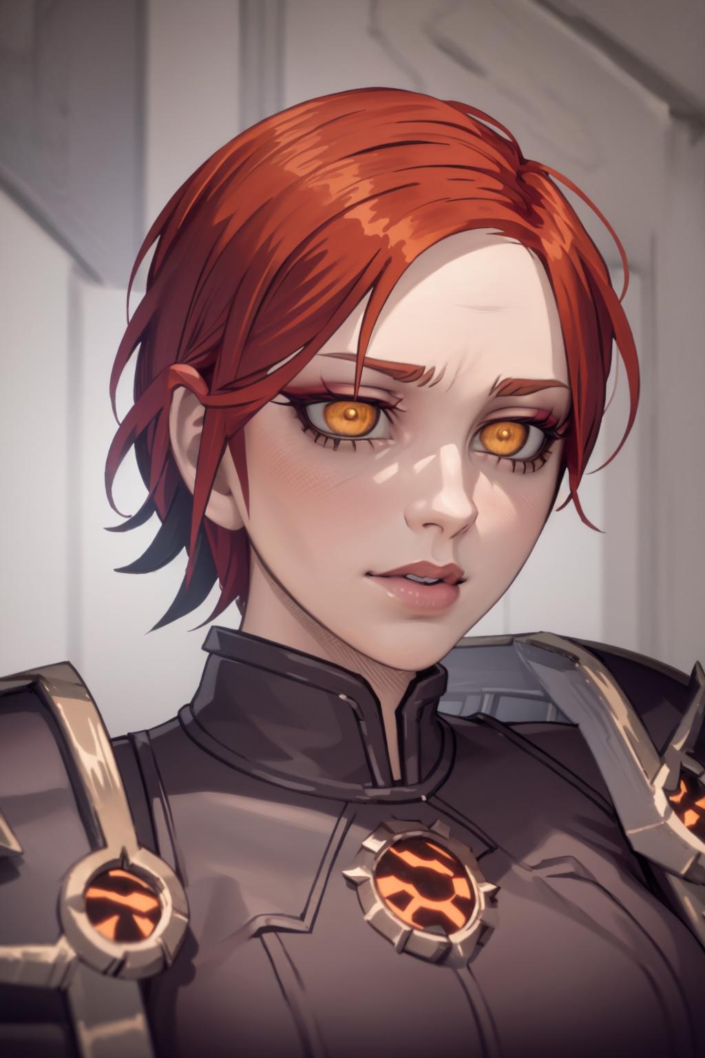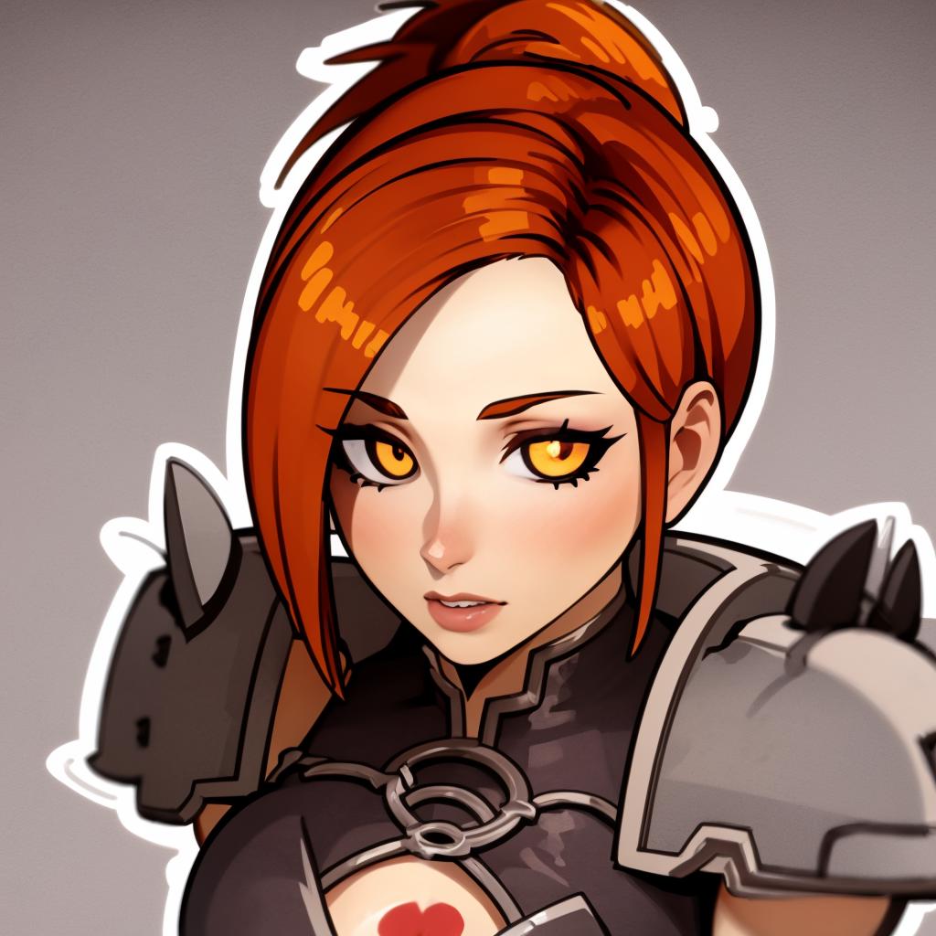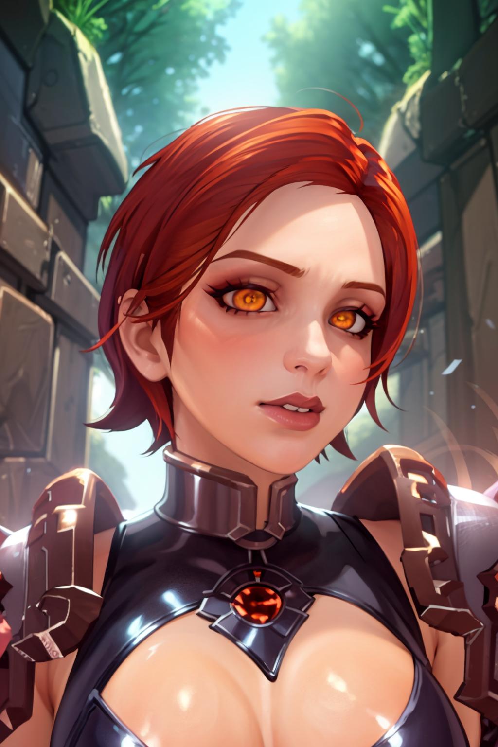 Other prompt : fishnets, lips, makeup, yellow eyes, armor, warlock shoulders