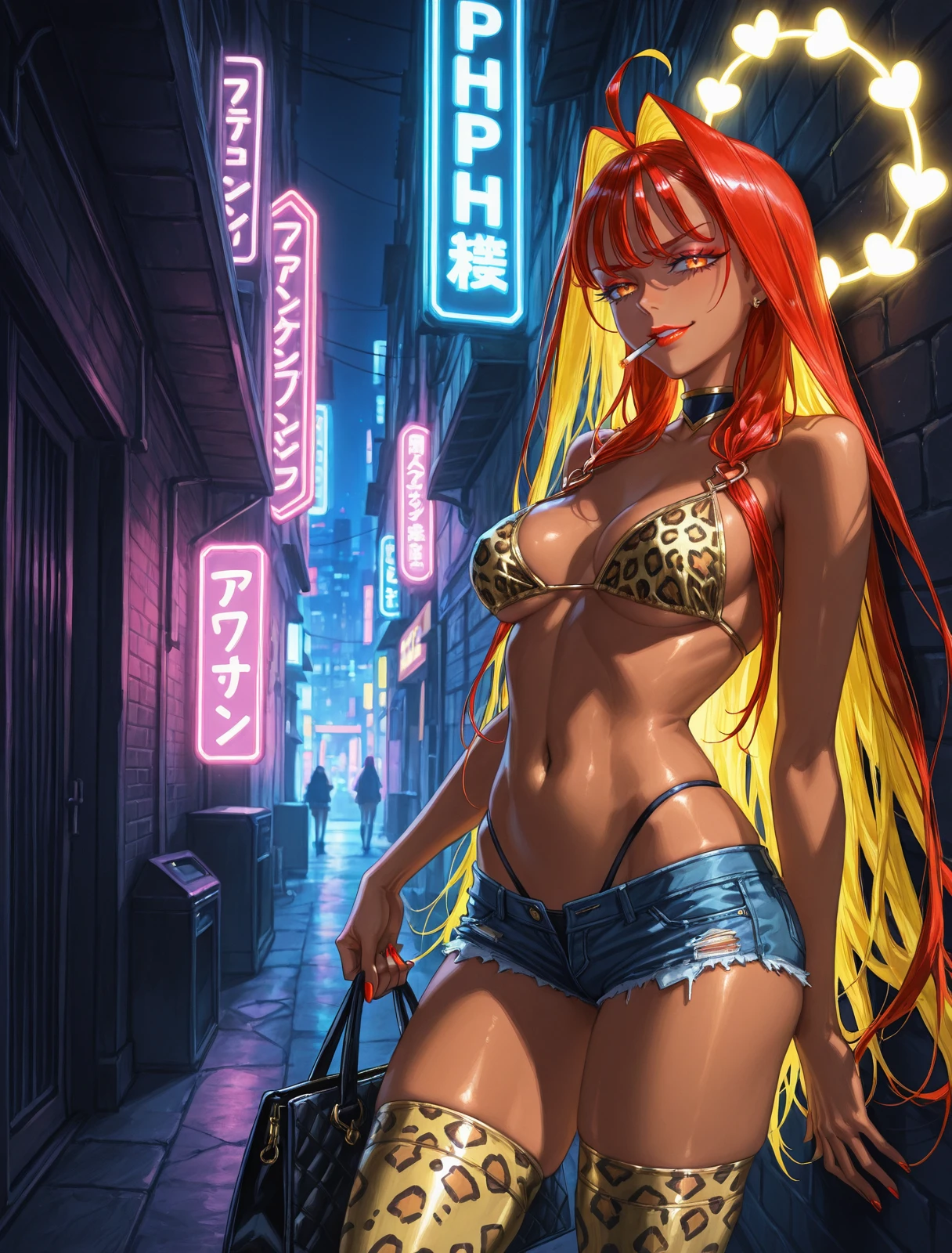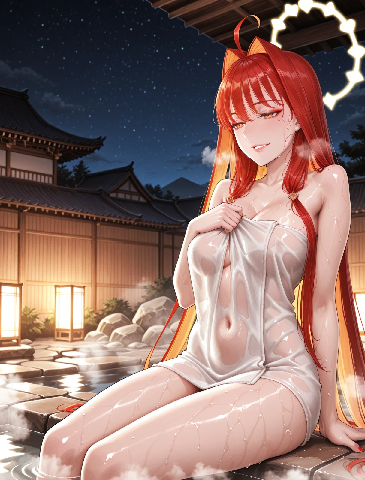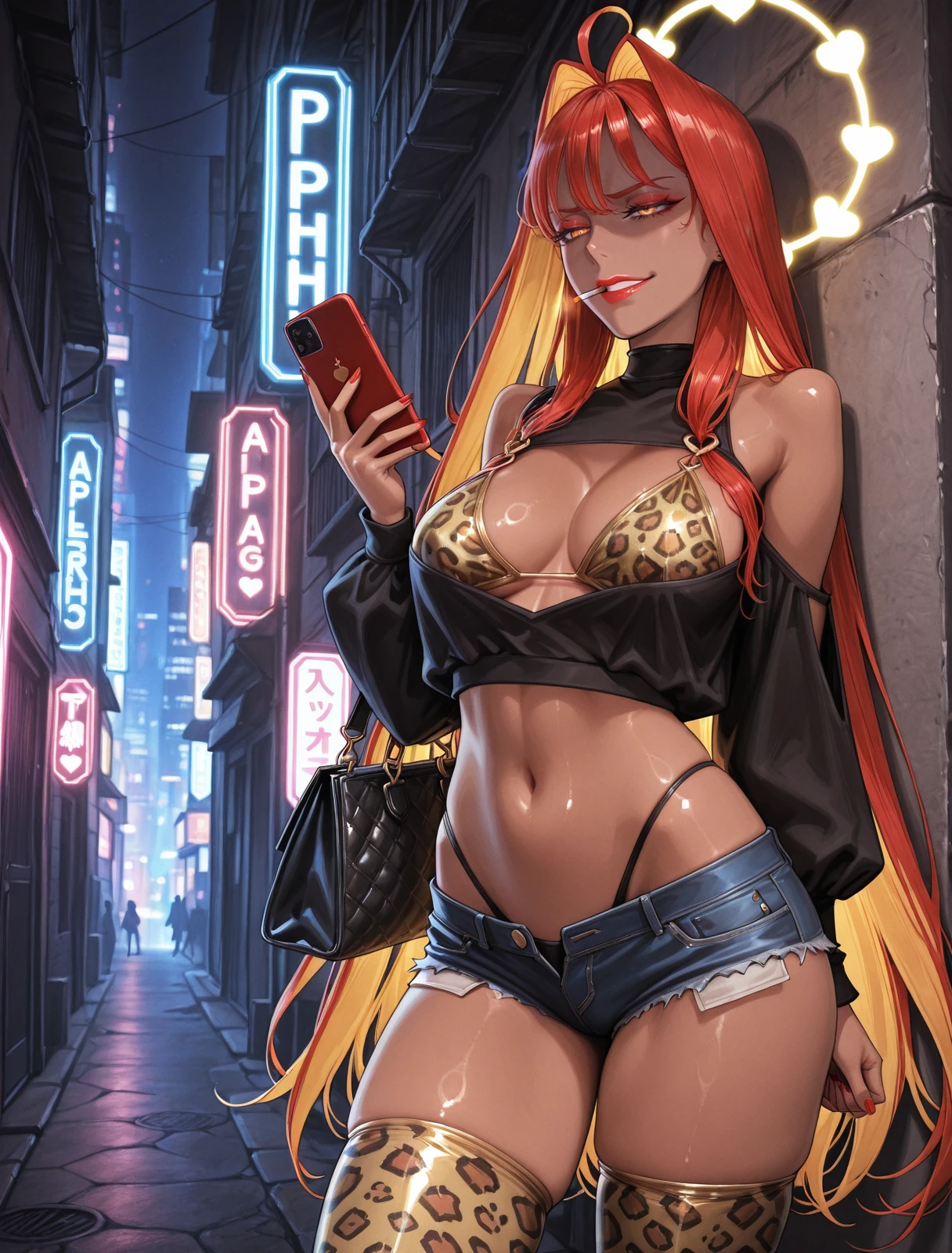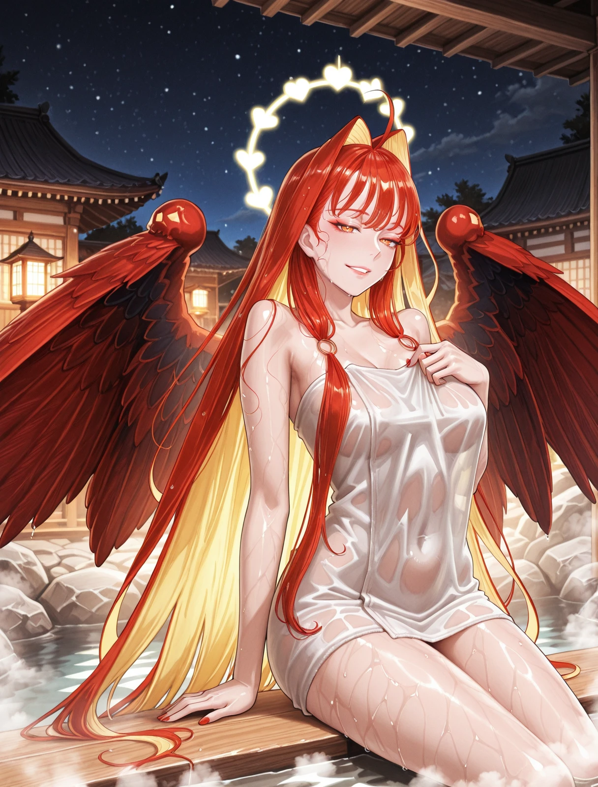 Aph0od1F4te,1girl,solo,ahoge,makeup,orange eyes,parted lips,medium breasts,two-tone hair,red hair,blonde hair,ahoge,very long hair,colored inner hair,hair intakes,red_nails,