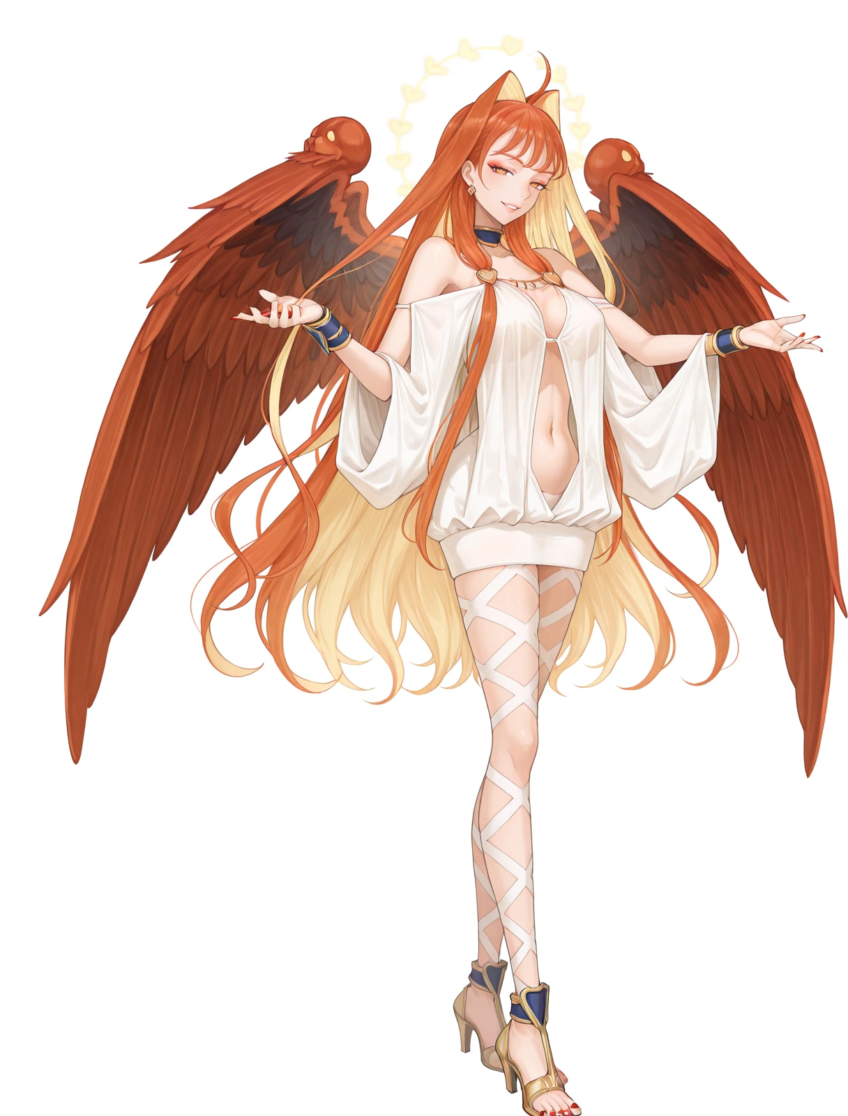 dress,navel,ribbon,jewelry,bare shoulders,earrings,choker,white dress,off shoulder,high heels,center opening,bracer,bracelet,short dress,stripes on thighs,