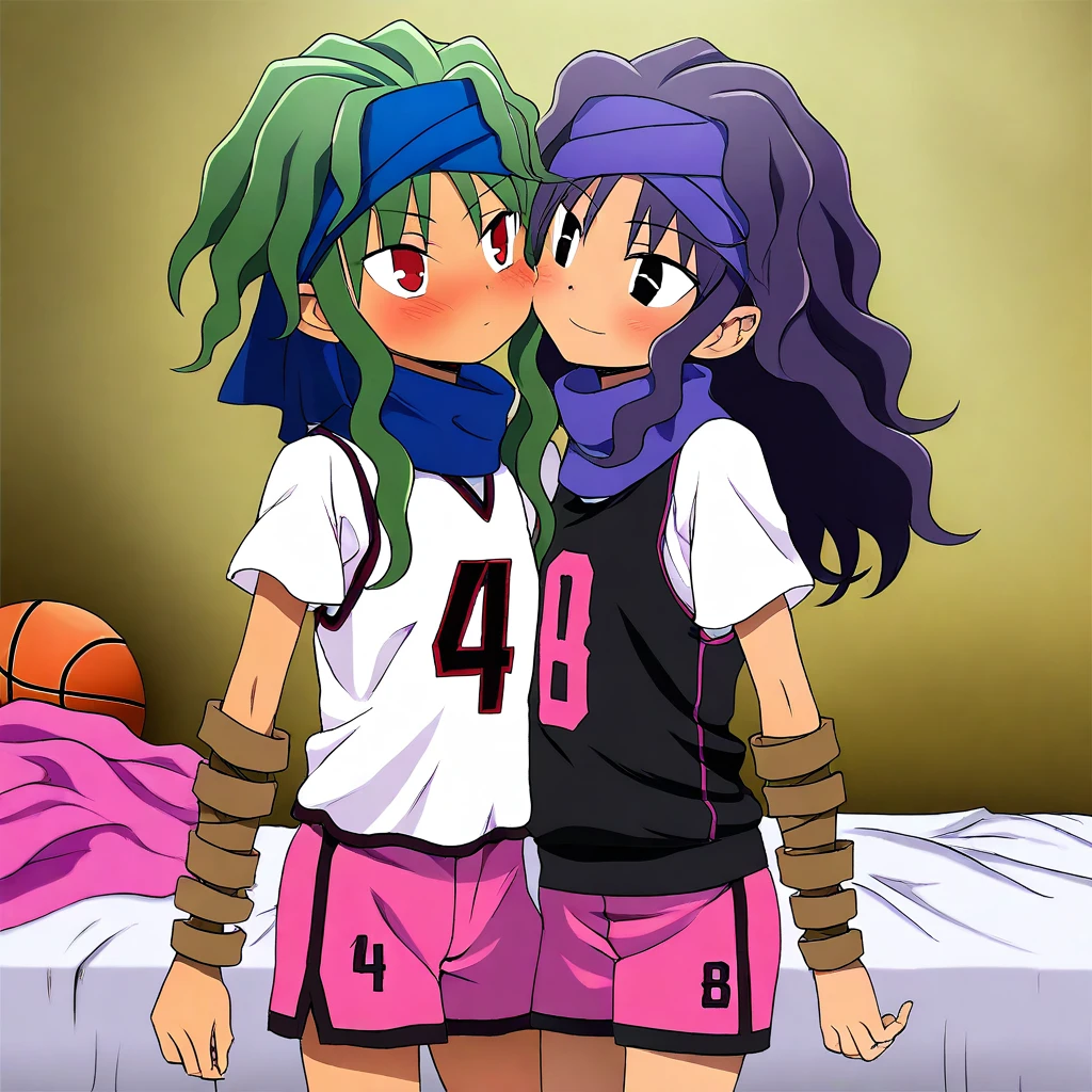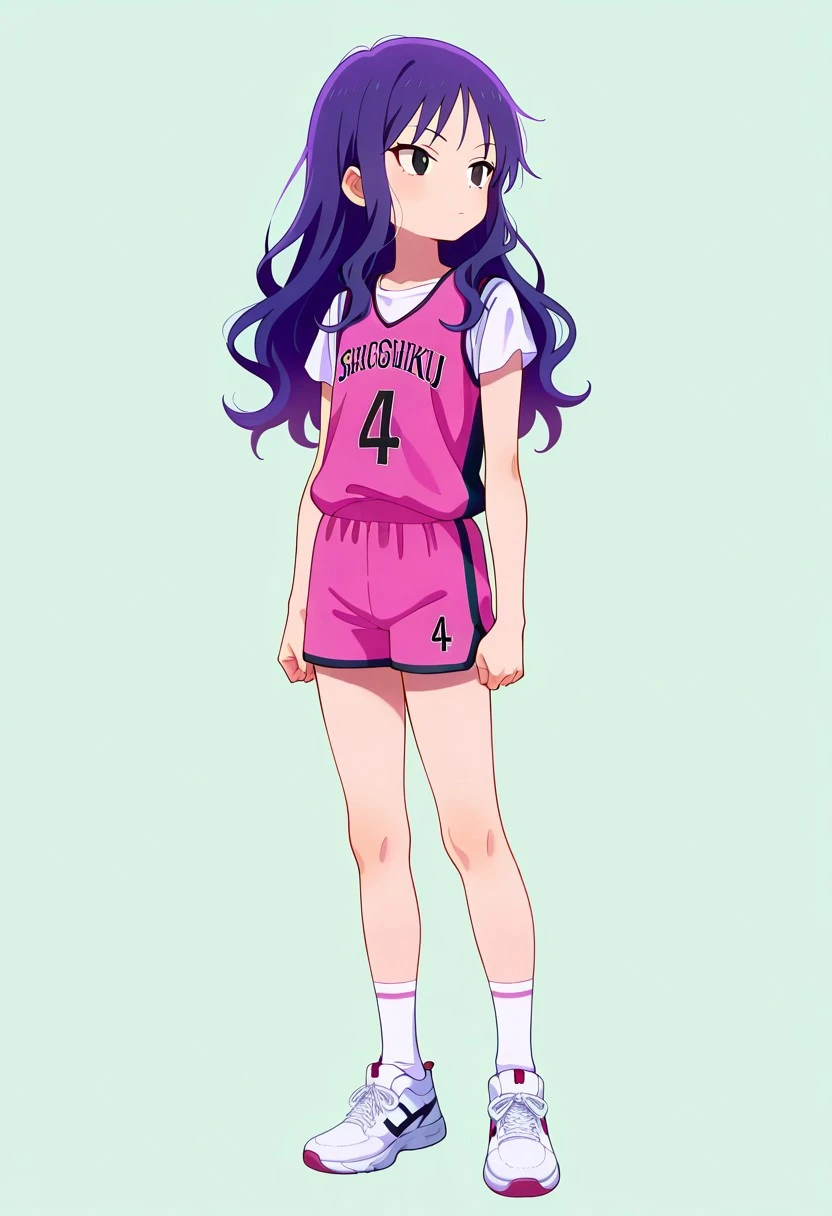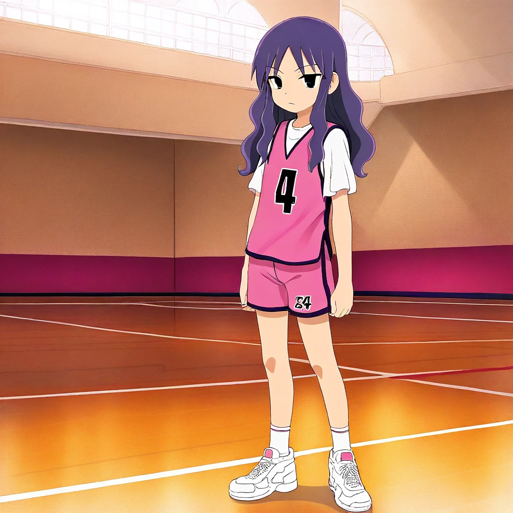 Rin: Orochi_GF, black eyes, Rin_GF, purple hair, long hair, sidelocks, basketball uniform, basketball jersey, pink basketball jersey, sportswear, sleeveless, short sleeves, short sleeves under sleeveless, number print, clothes writing, shorts, pink shorts, short socks, white socks, sneakers, white footwear,