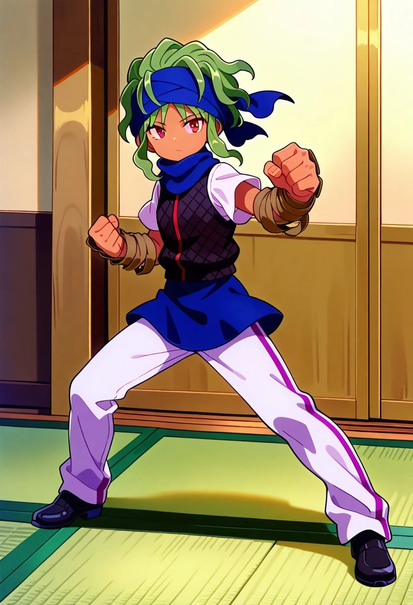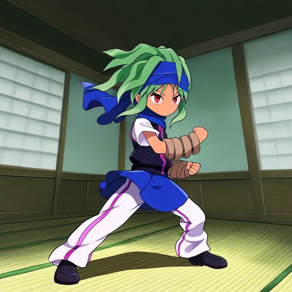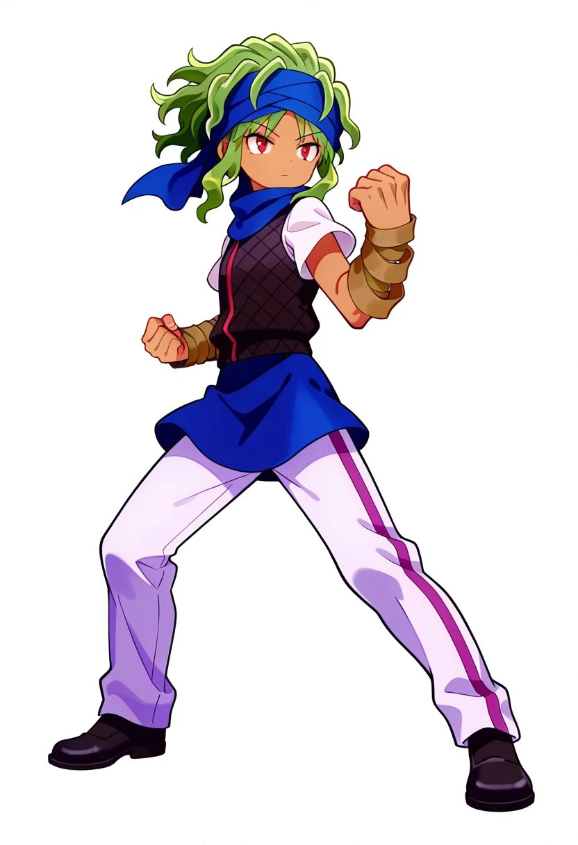 Orochi: Orochi_GF, red eyes, Orochi_BW, green hair, sidelocks, headband, purple headband, purple scarf, scarf, white shirt, black vest, vest, skirt, purple skirt, armwraps, white pants, skirt over pants, black shoes,