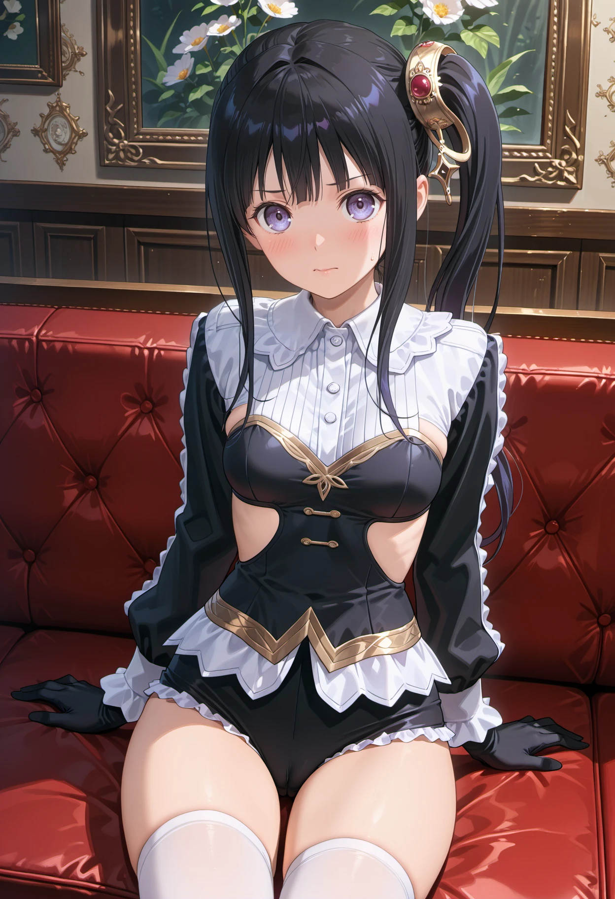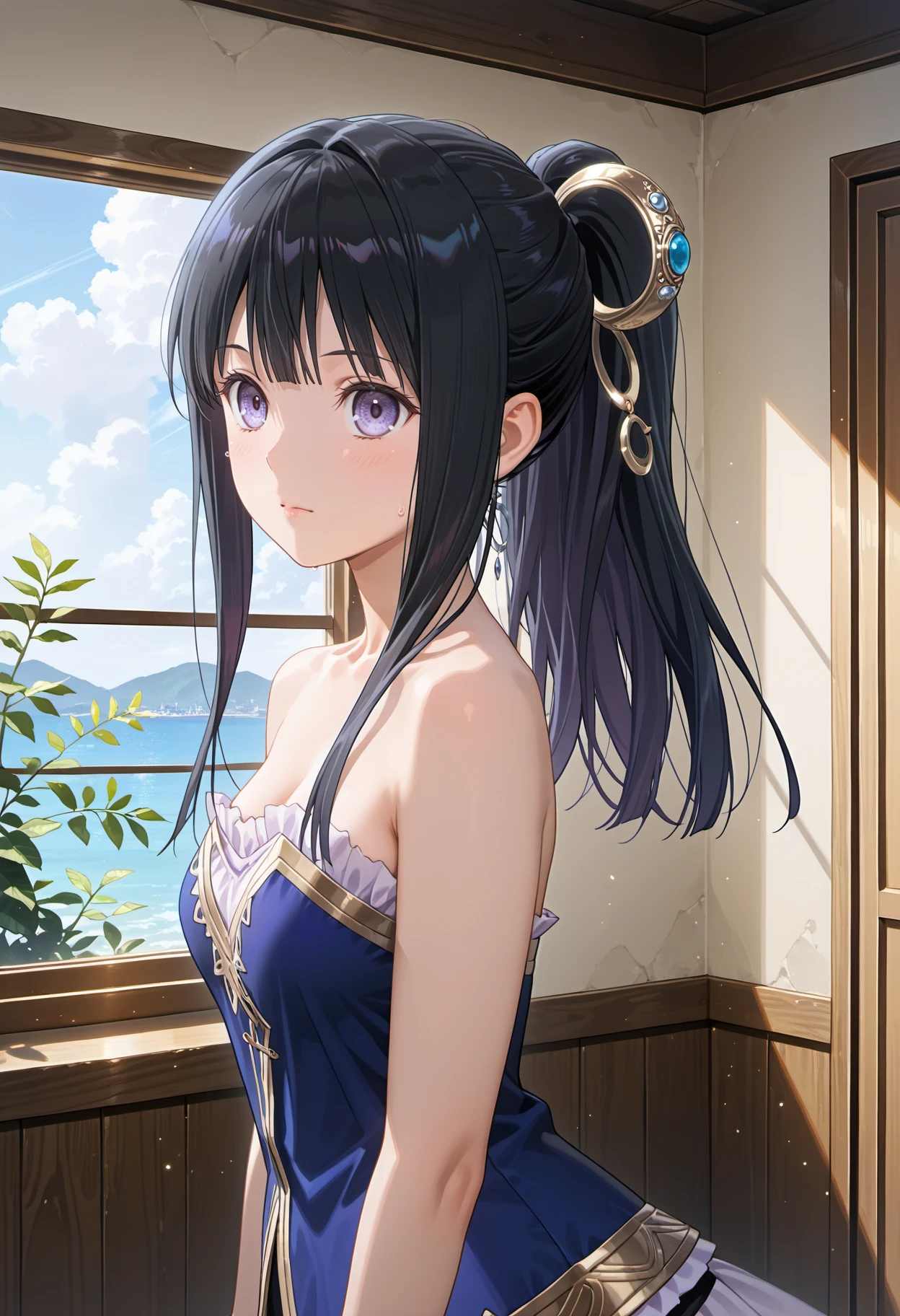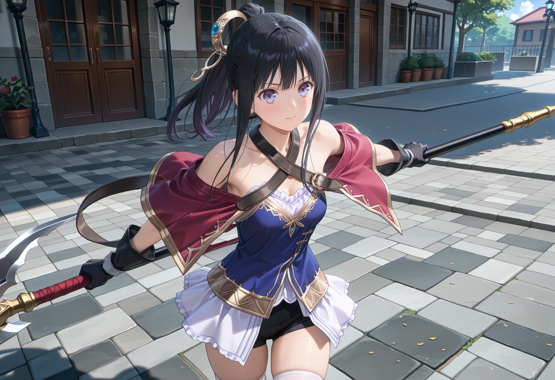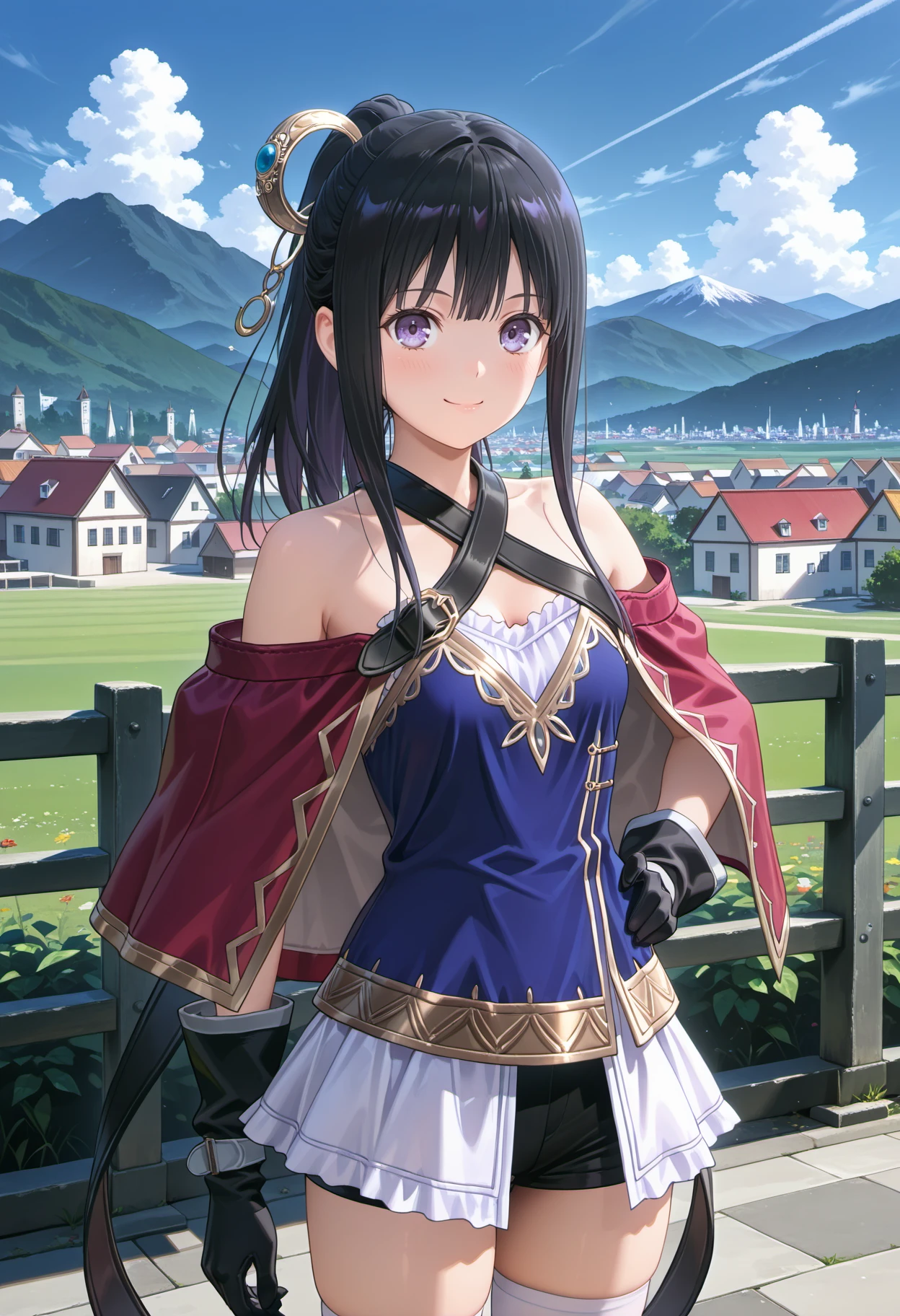 mimi2nd, long hair, black hair, bangs, sidelocks, ponytail, purple eyes, silver hair ornament, gloves, blue corset, frills, bare shoulders, skirt, black shorts, thighhighs, white thighhighs, black footwear, halter capelet, belt