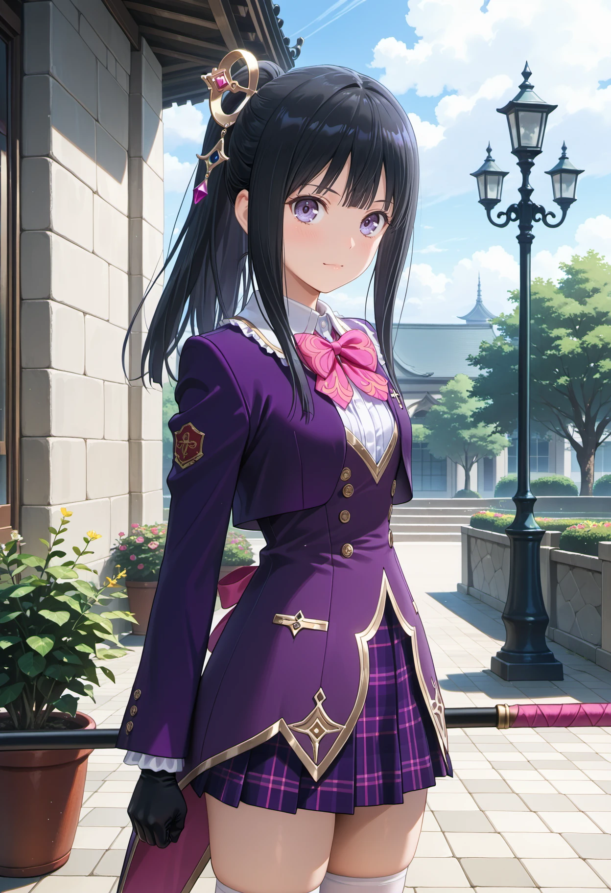 mimischool, long hair, black hair, bangs, sidelocks, ponytail, purple eyes, brass hair ornament, pink bow, bowtie, school uniform, black gloves, purple jacket, tailcoat, plaid skirt, frills, thighhighs, white thighhighs, black loafers