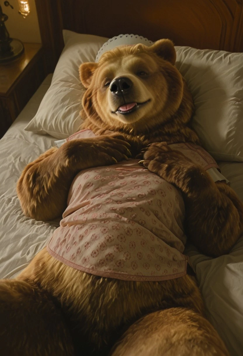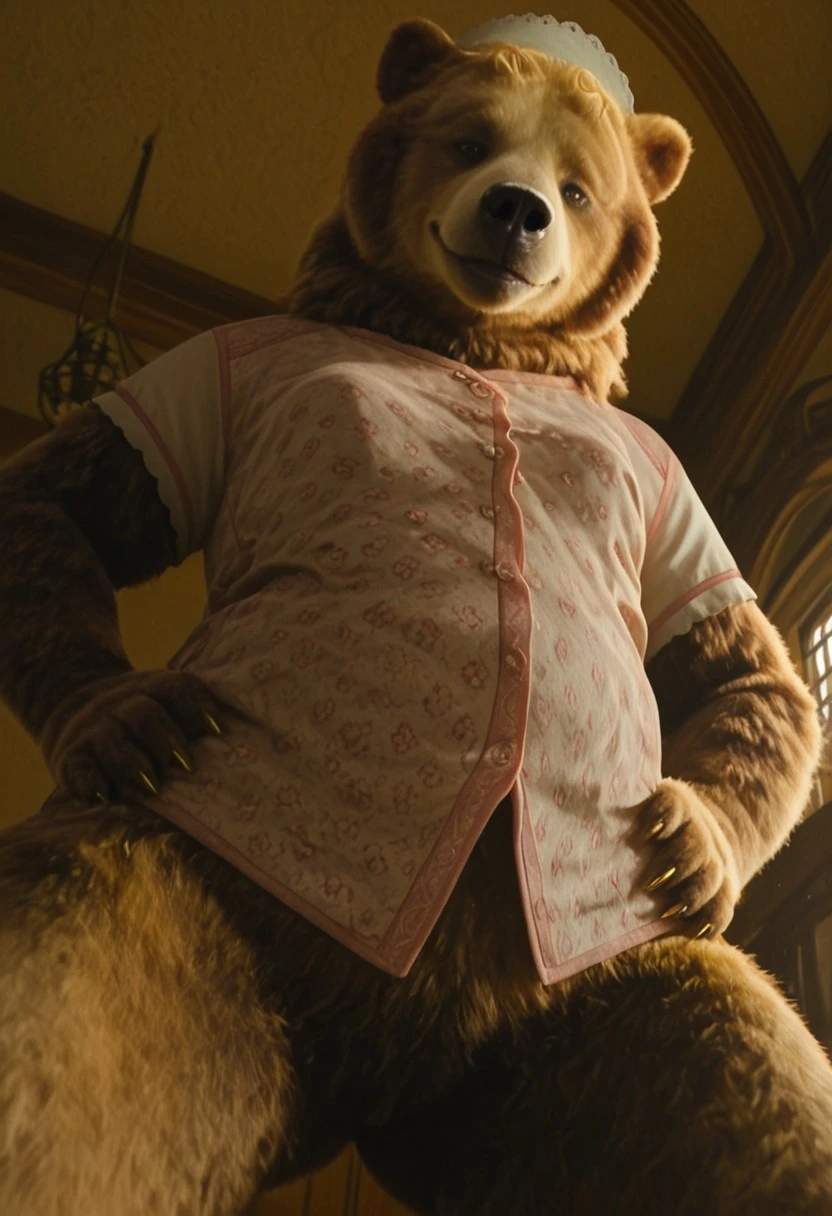 dulcibear_wicked, 1girl, furry, female brown bear, brown and golden fur (light golden fur on face), bear ears, short golden hair, brown eyes, black nose, golden claws, white maid headwear, pink top (small flowers patterns, short white sleeves), bottomless, plump, bulk, flat chest,