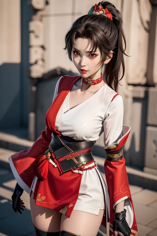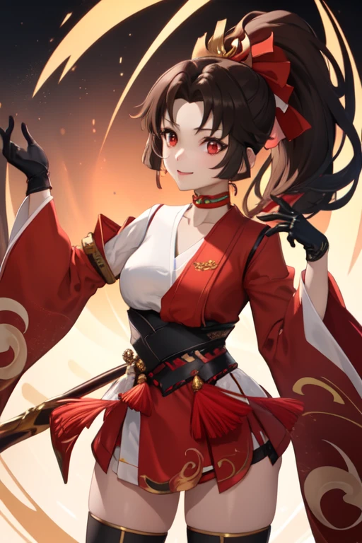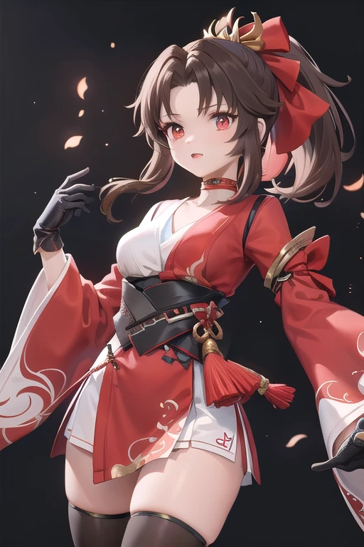 with outfit : thighhighs, gloves, long sleeves, choker, black gloves, black thighhighs, wide sleeves, sash, obi, red choker, kimono, red kimono, asymmetrical sleeves