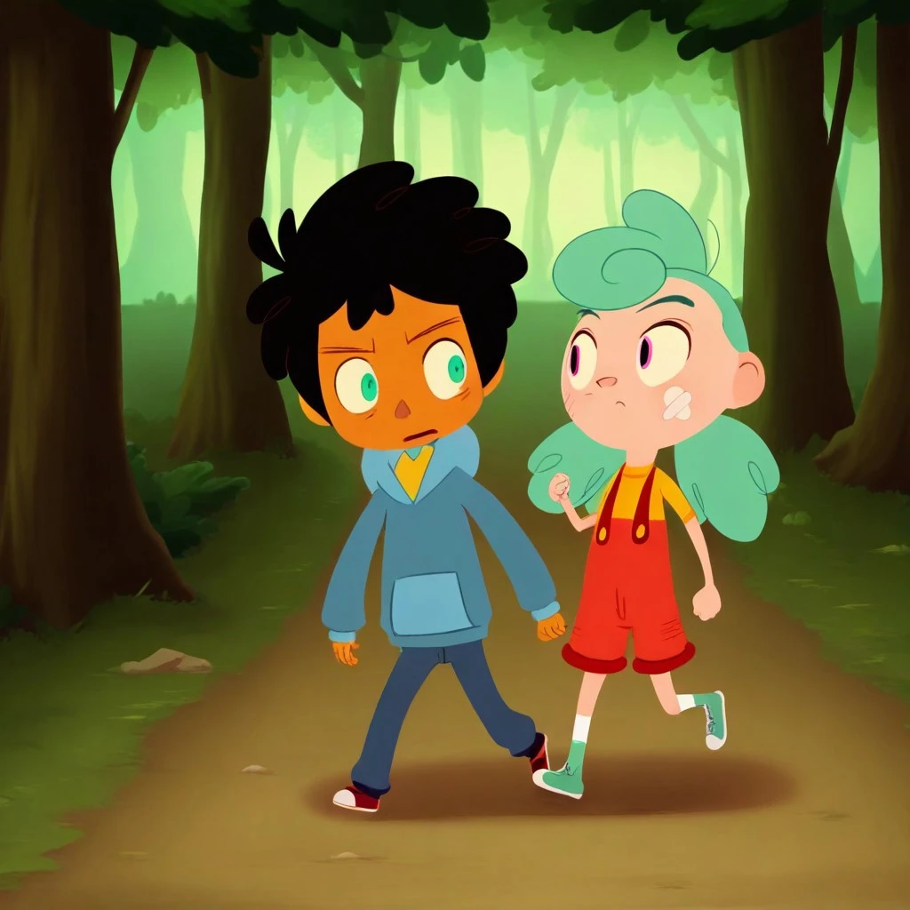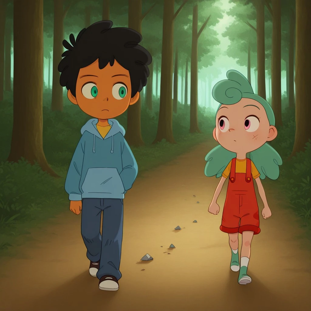 makki_cc, (1boy, max_cc, dark-skinned male, black hair, hoodie, green eyes), break, (1girl, nikki_cc, green hair, pink eyes, overalls)