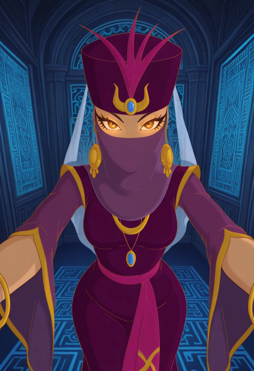 sh4mts4r, brown eyes, jewelry, hat, veil, purple dress, long sleeves, gloves, belt,