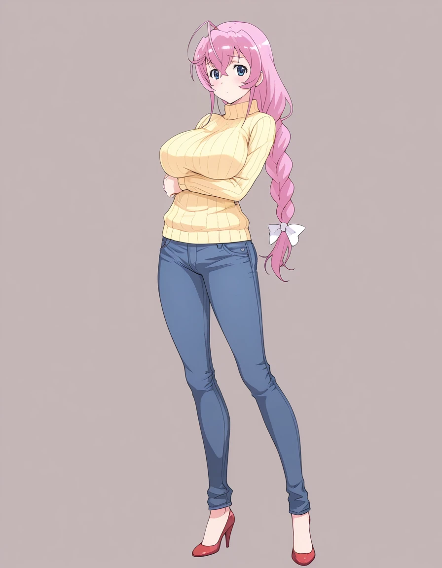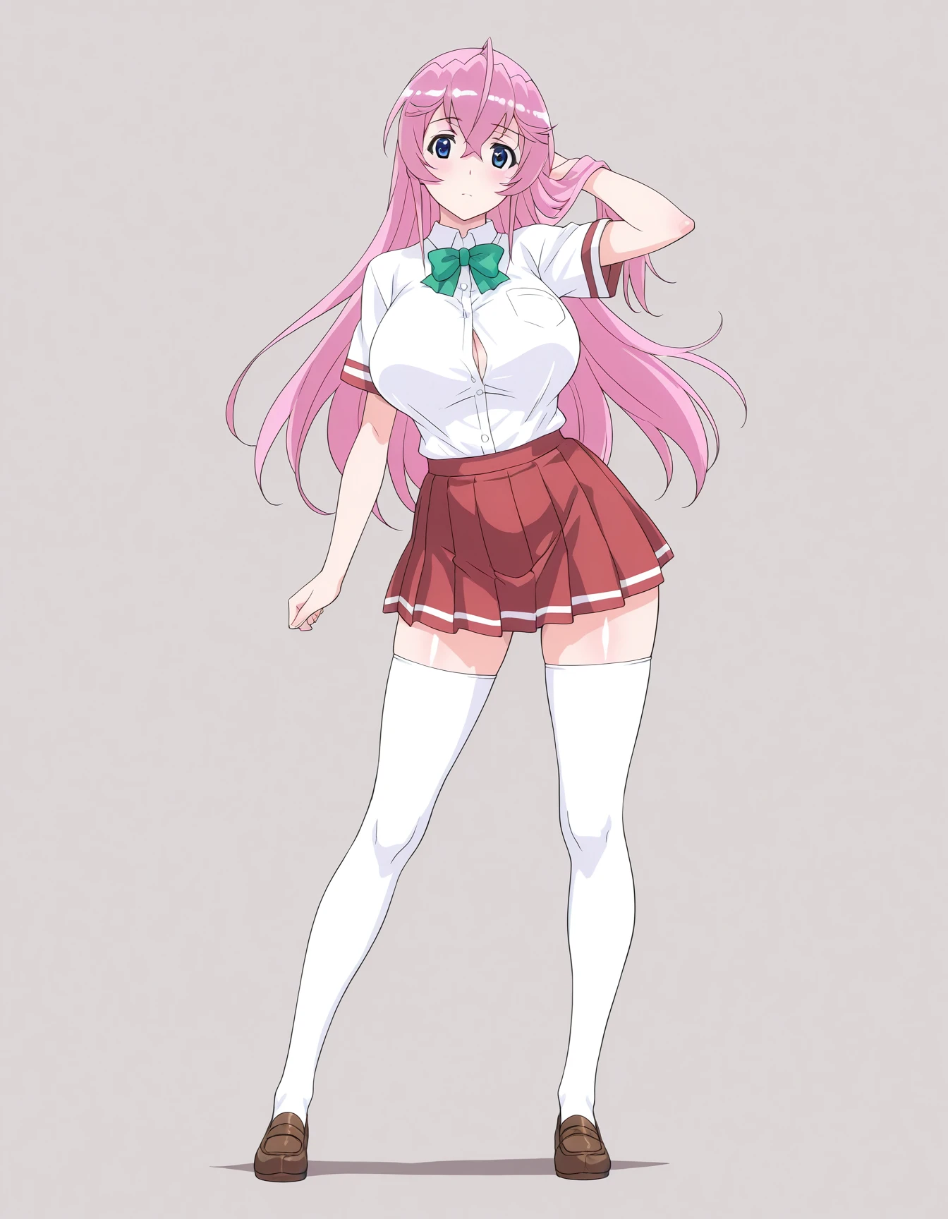 mai_oto,mai_otomeot,long_hair,pink_hair,blue_eyes,hair_between_eyes,school_ uniform,green_bow,red_skirt,pleated_skirt,white_thighhighs,loafers