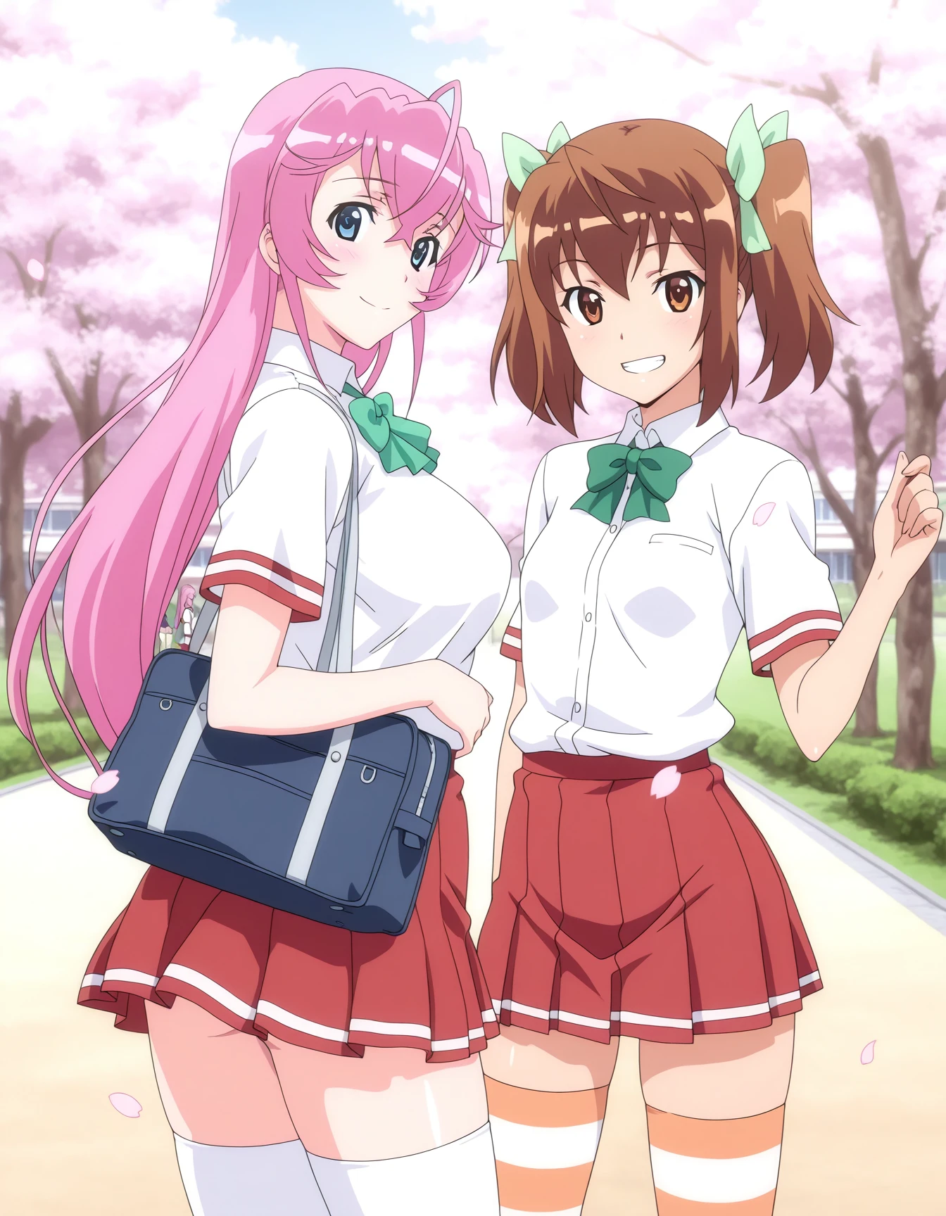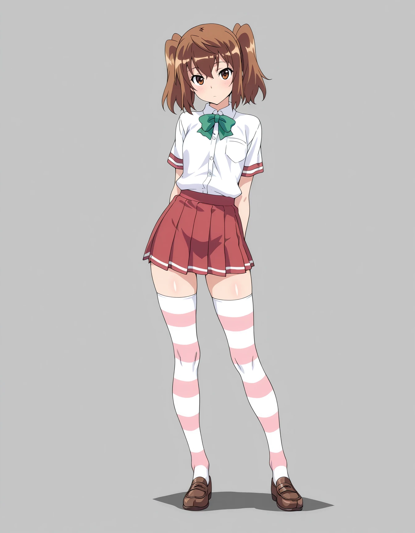 mai_oto,mai_rinkaot,brown_hair,twintails,brown_eyes,school uniform,green_bow,red_skirt,pleated_ skirt,striped_thighhighs,loafers