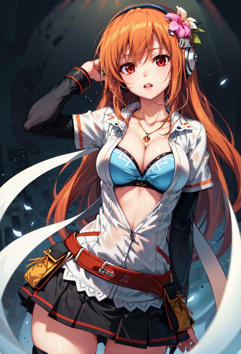 Open shirt: 9th style, cleavage, open shirt, jewelry, skirt, blue thighhighs, hair ornament, white shirt, headphones, belt, hair flower