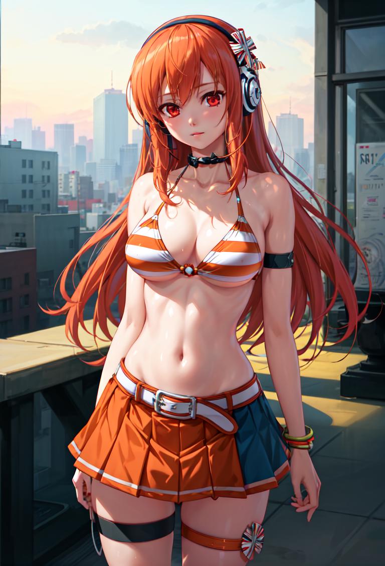 Resort anthem (can't make transparent jacket): resort anthem, pleated skirt, orange skirt, jewelry, striped bikini, belt, headphones, thigh strap