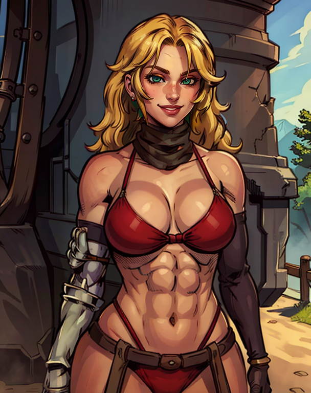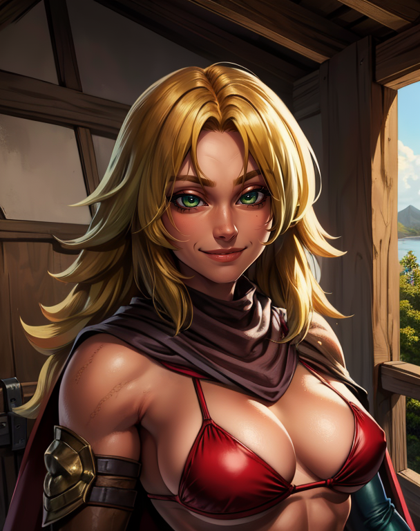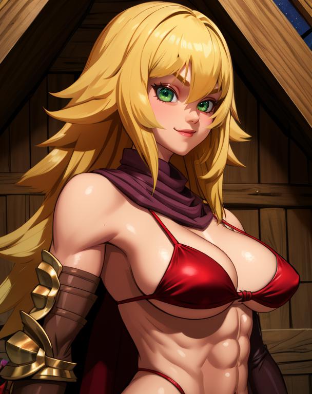 red bikini,single gauntlet,elbow gloves,chaps,cape,