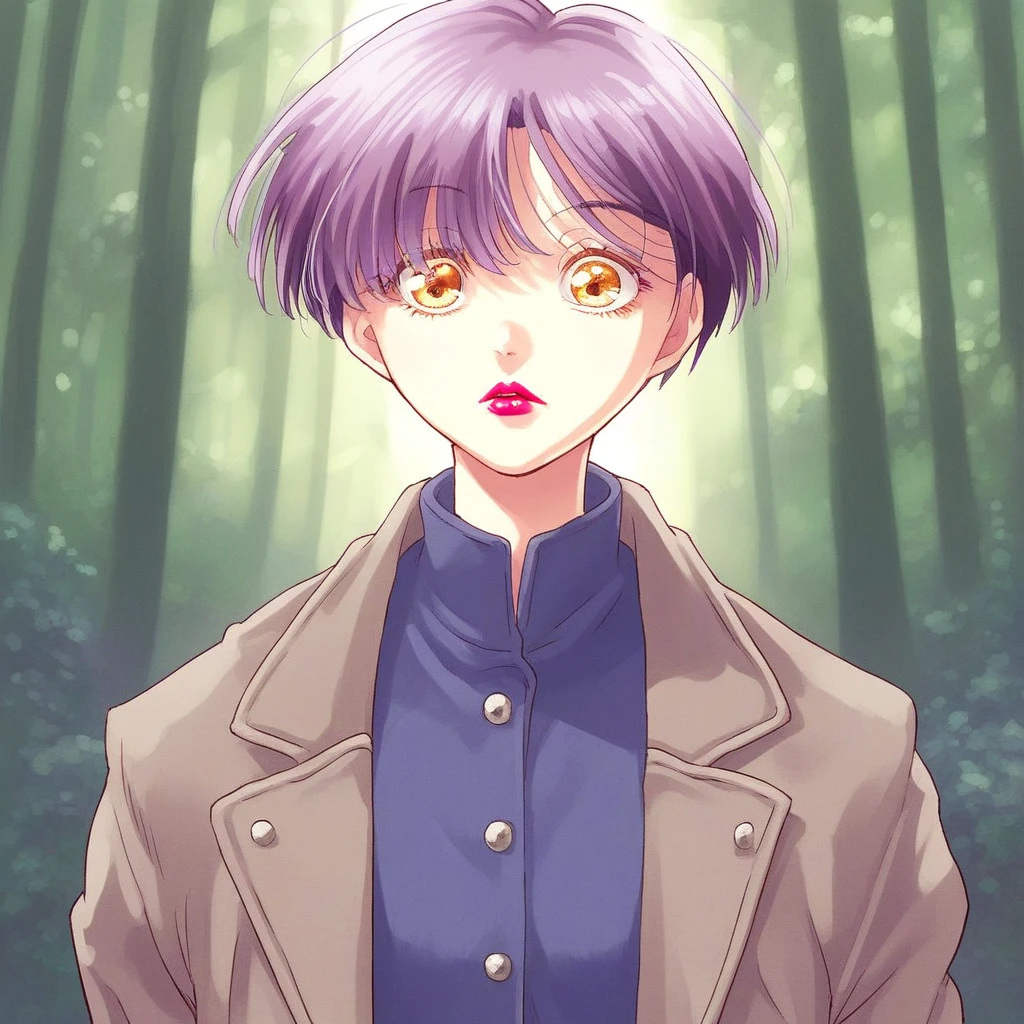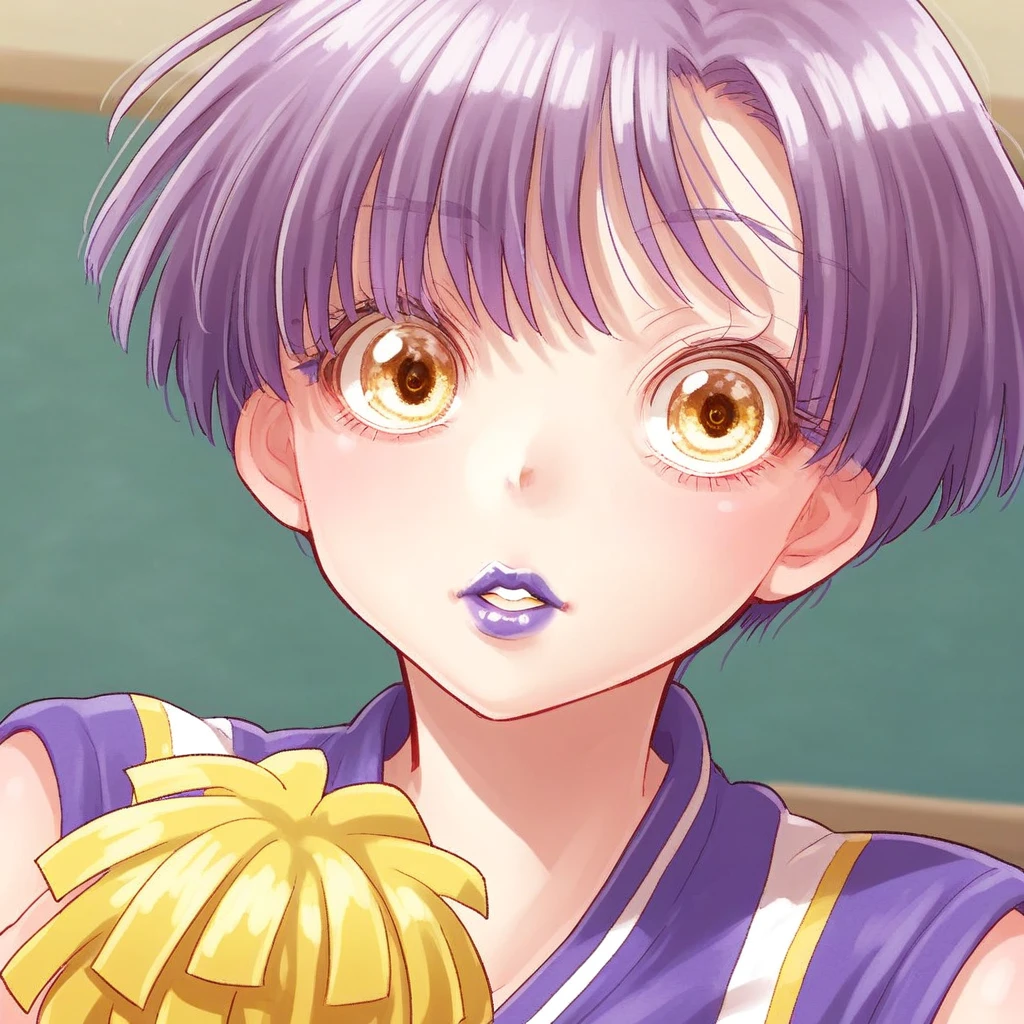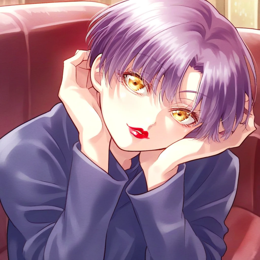 mikadono_kazuki, short hair, purple hair, yellow eyes, lipstick