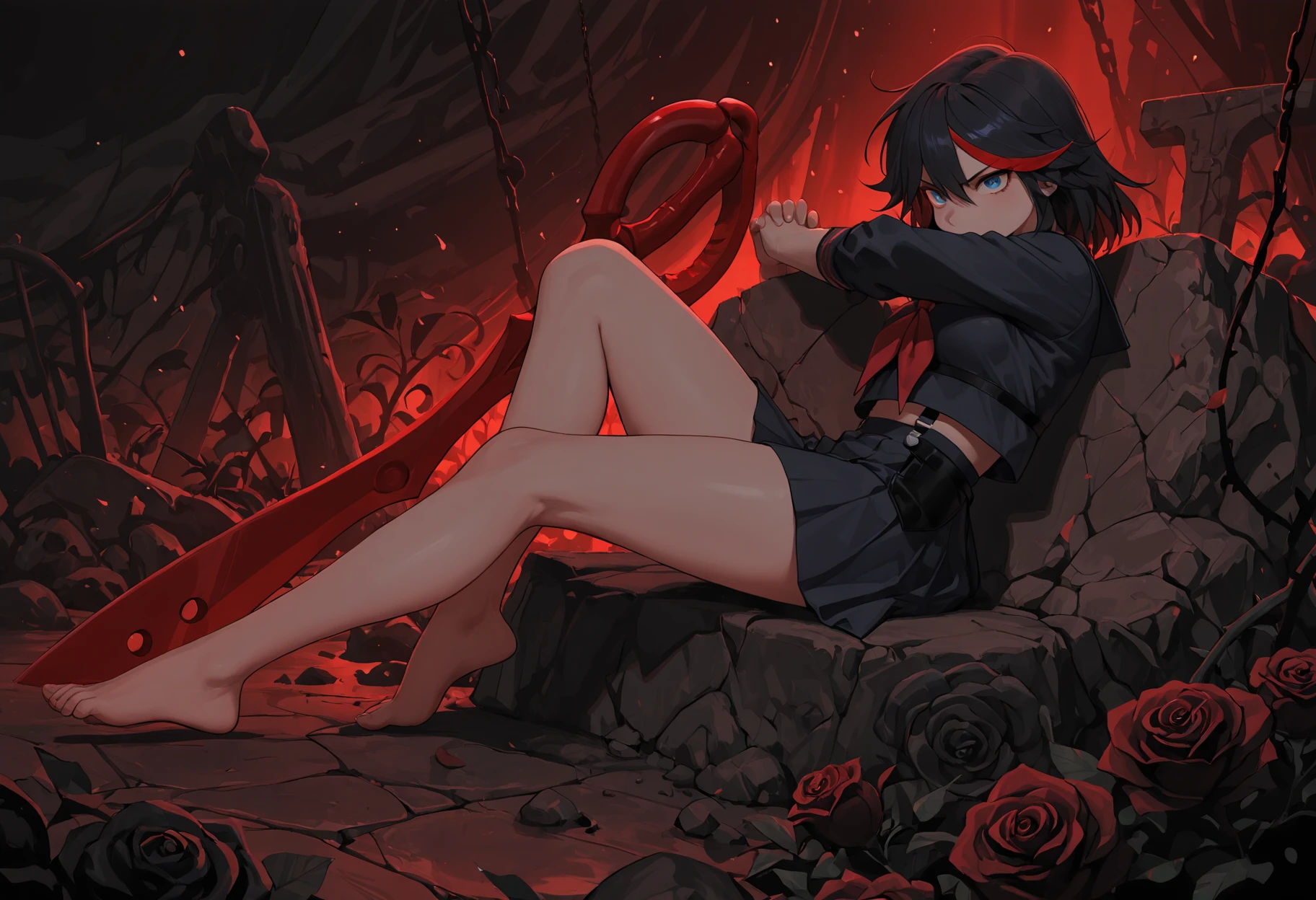full body view, sitting, outstretched leg, one knee up,