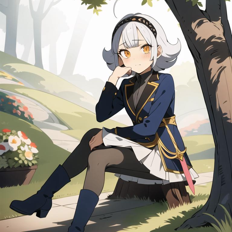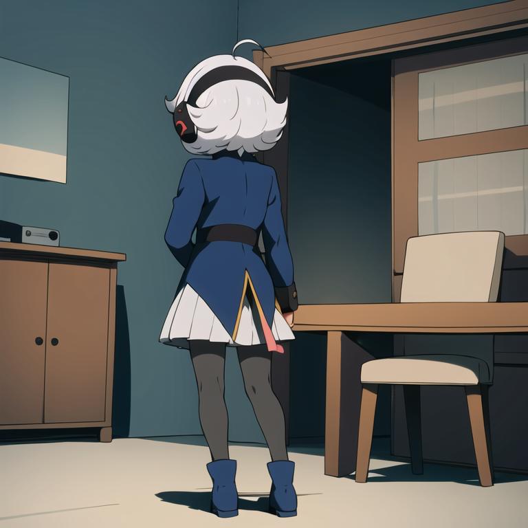 Base outfit: long sleeves, jacket, blue footwear, grey pantyhose, blue jacket, white skirt, pleated skirt, boots, weapon, sword