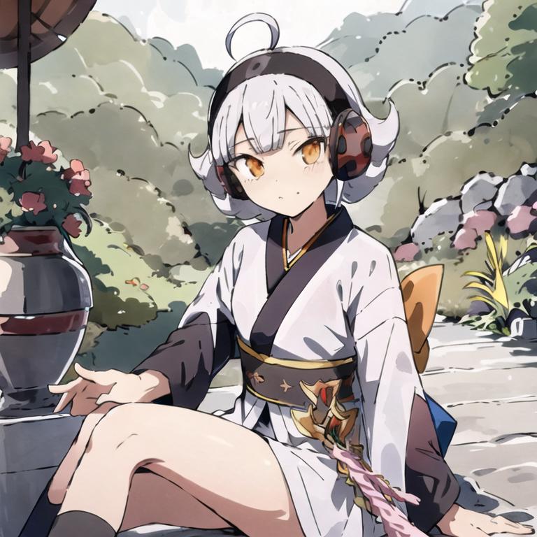 Hair/Characteristics: short hair, ahoge, white hair, grey hair, hairband, orange eyes, headphones, blunt bangs,