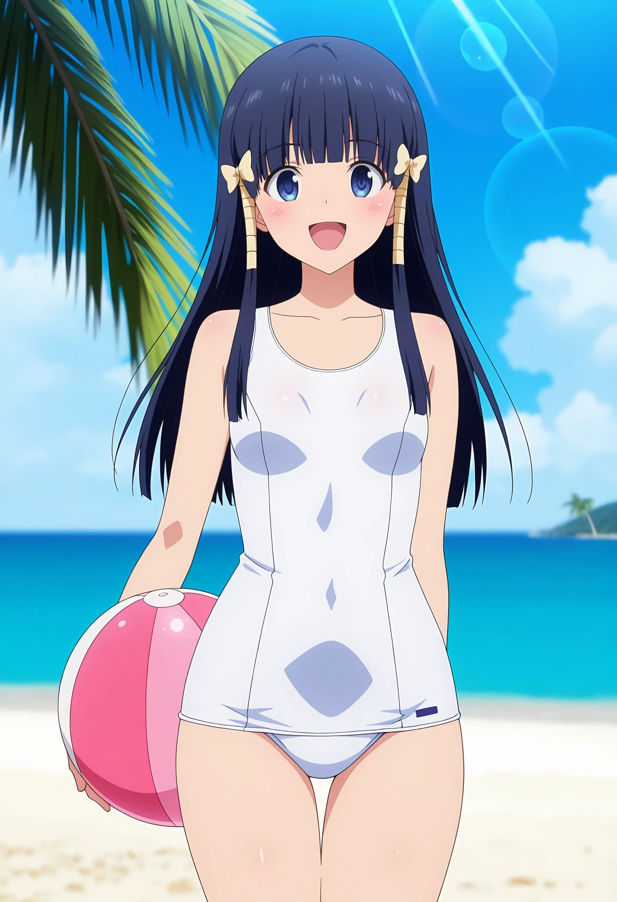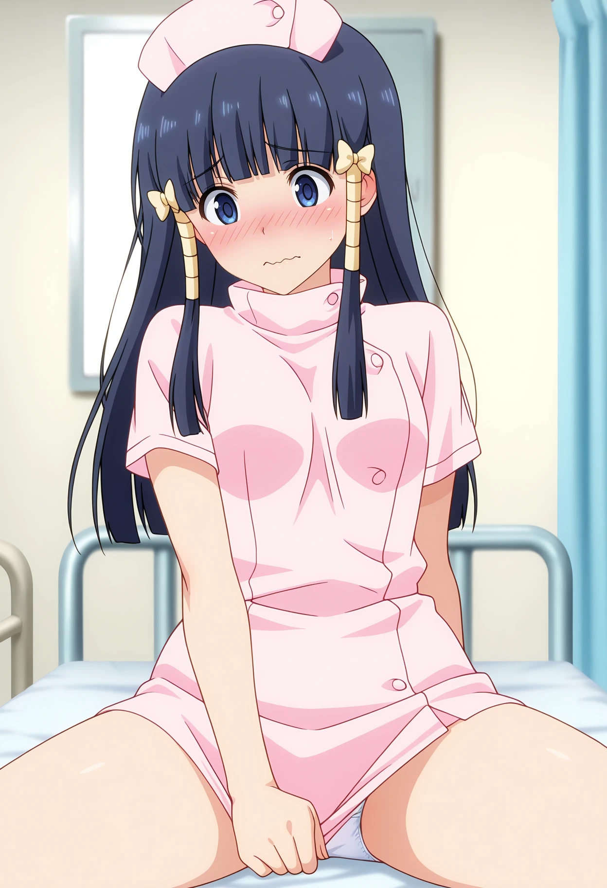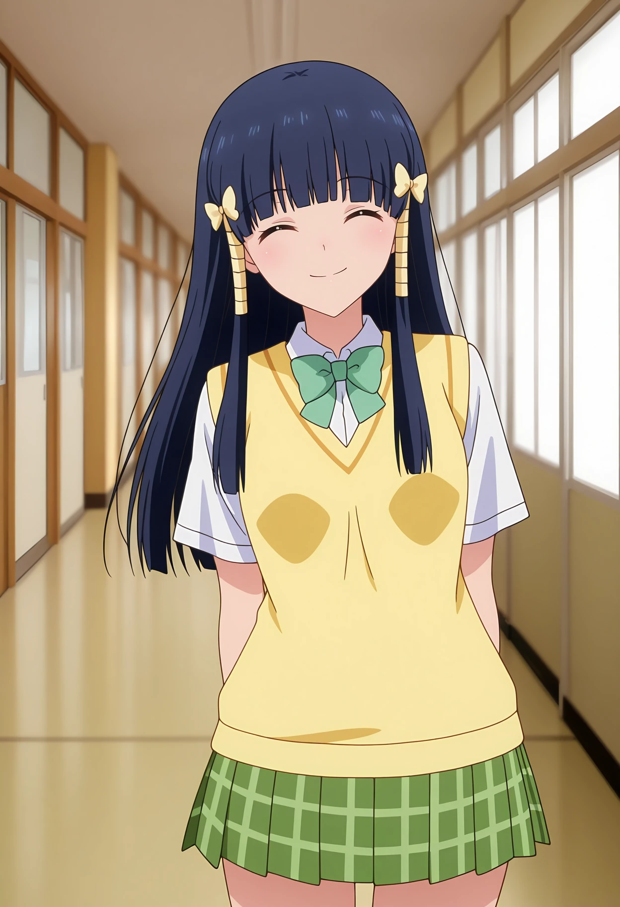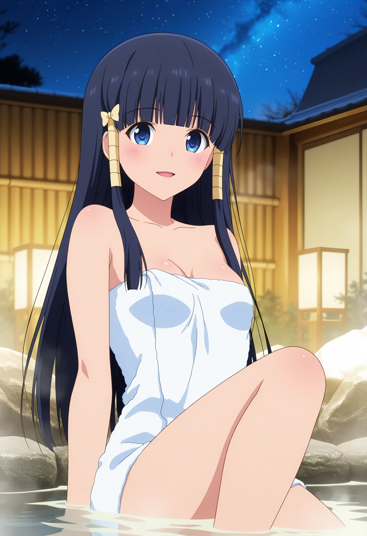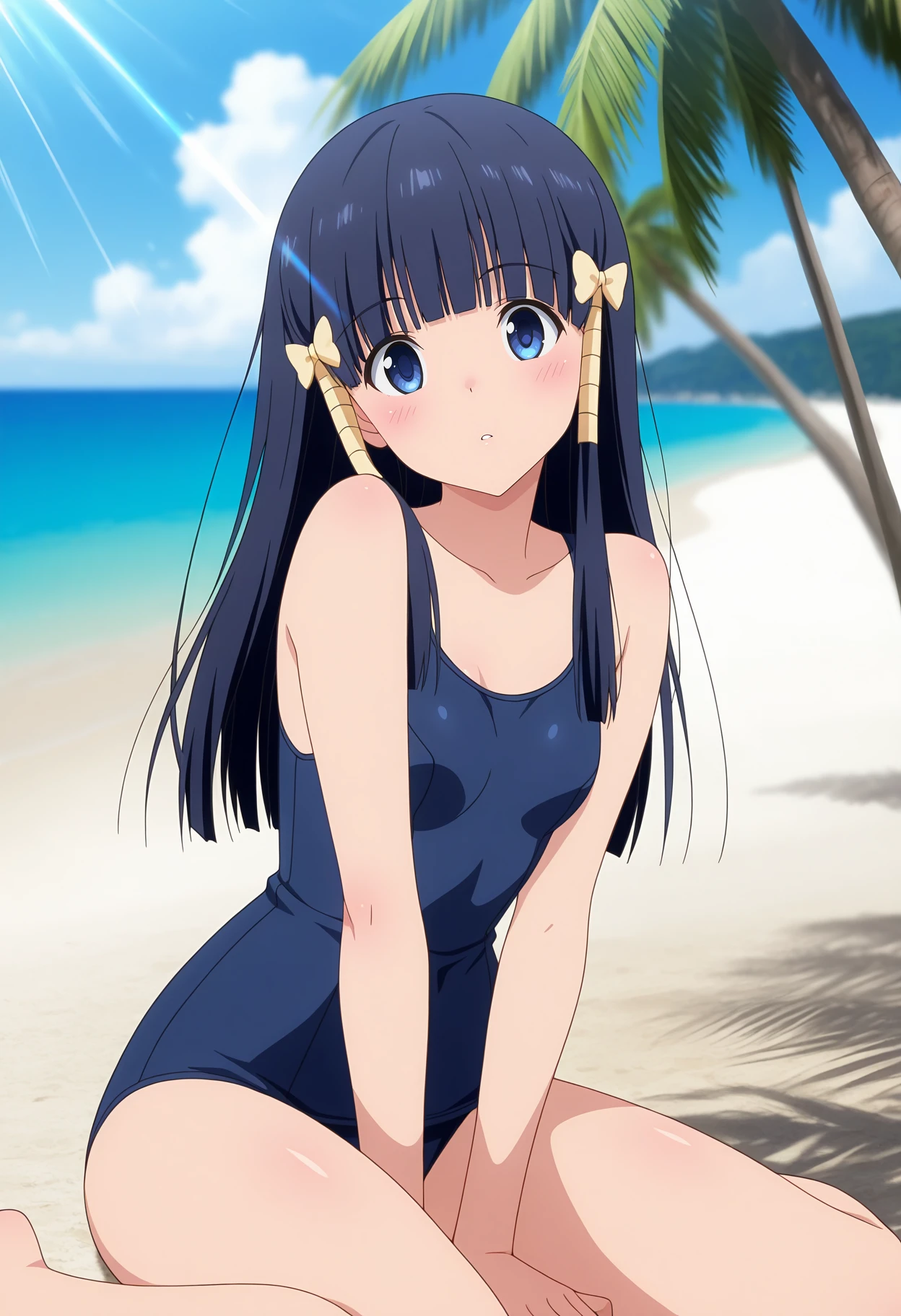 blunt bangs, long hair, black hair, blue eyes, hair bow, tress ribbon