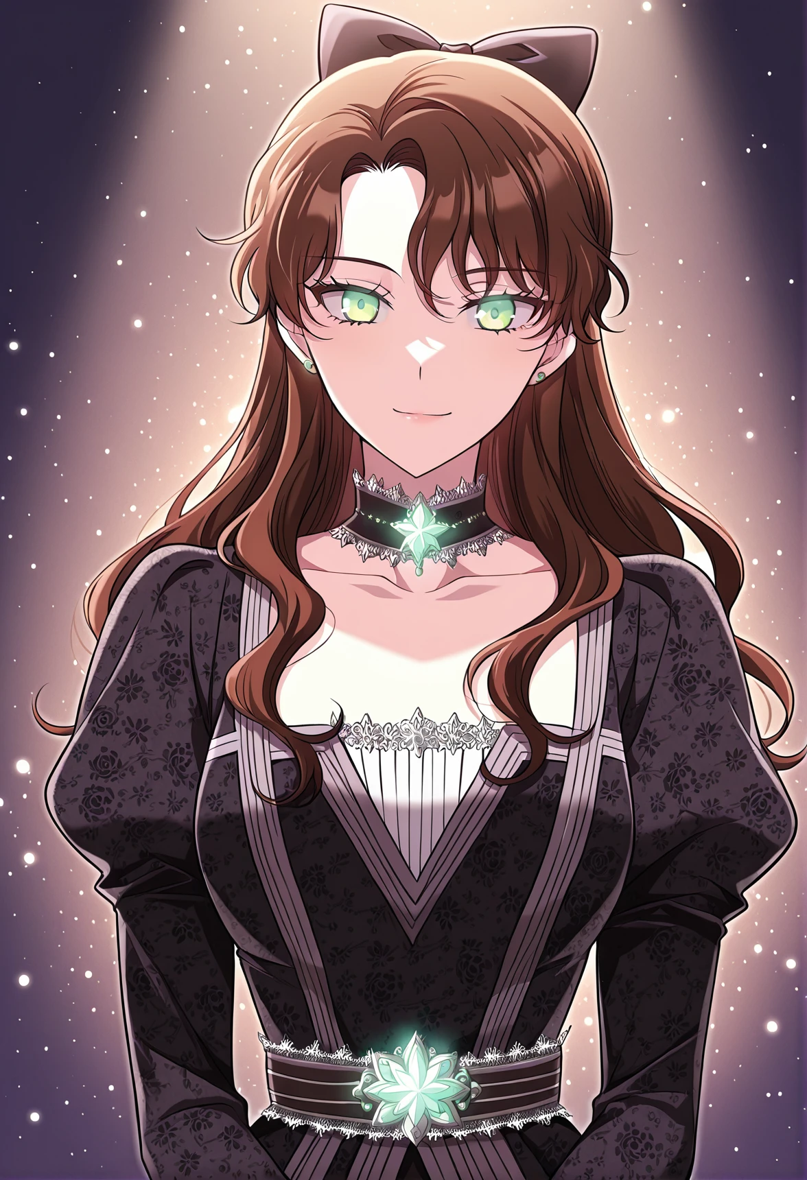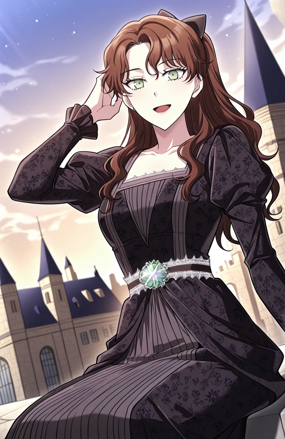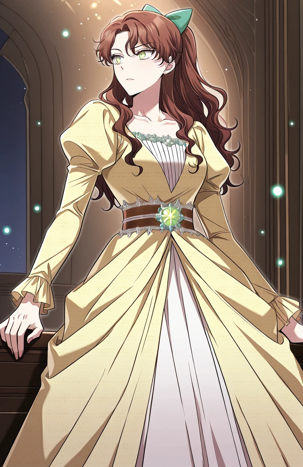 Julian, 1girl, solo, long hair, brown hair, wavy hair, hair between eyes, side bangs, green eyes, half updo, partially tied hair, hair bow,