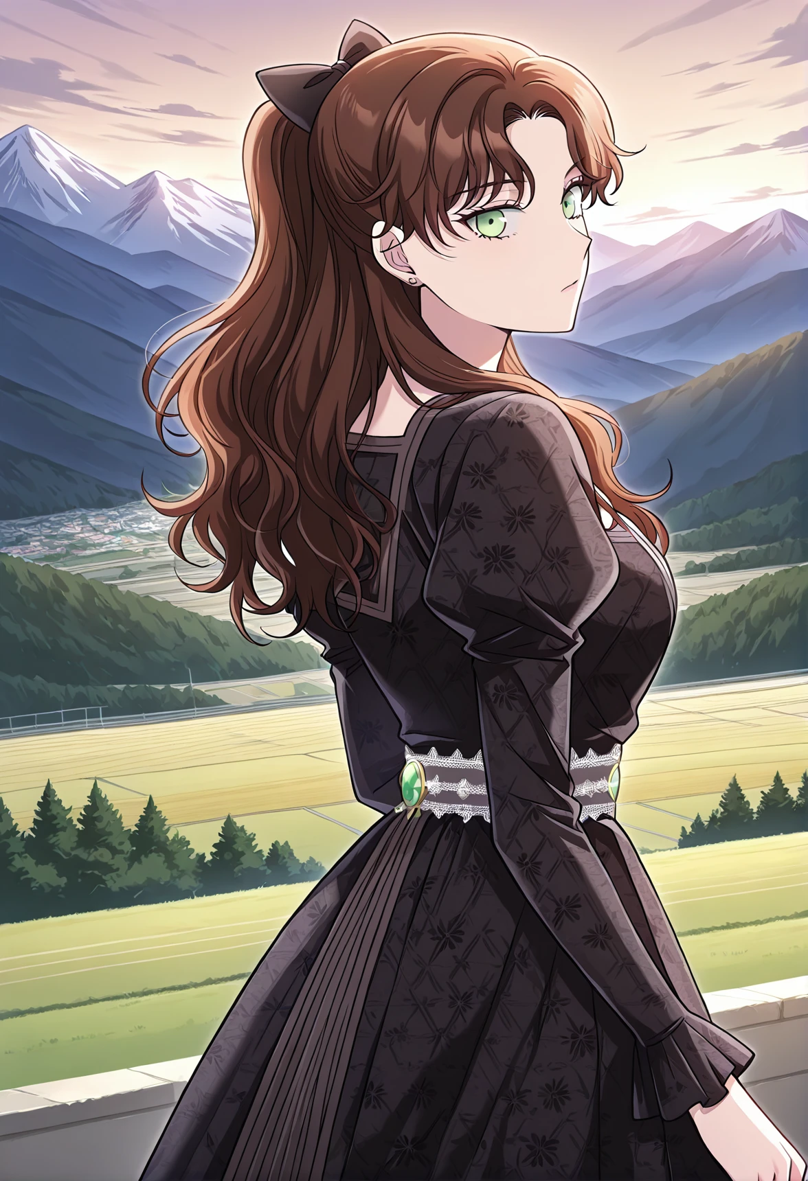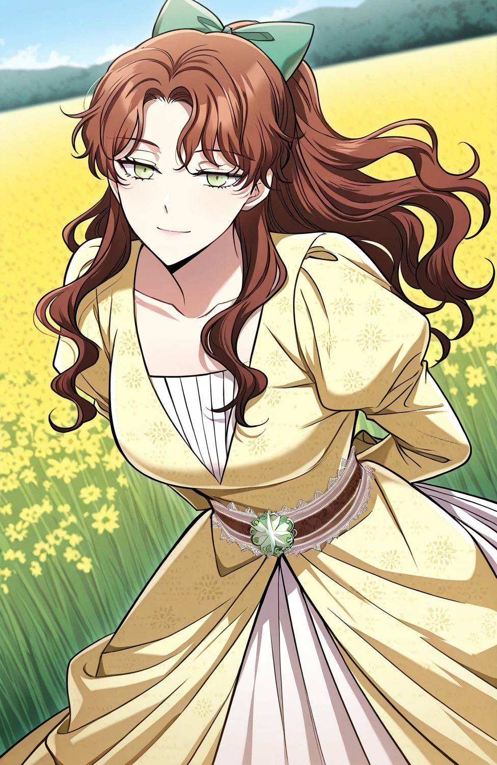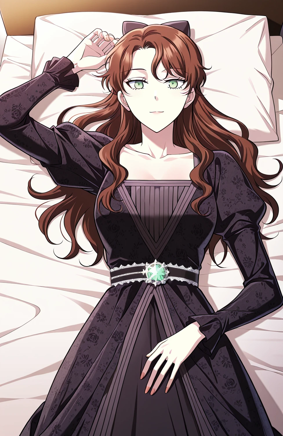 Julian, 1girl, solo, long hair, brown hair, wavy hair, hair between eyes, side bangs, green eyes, half updo, partially tied hair, hair bow,