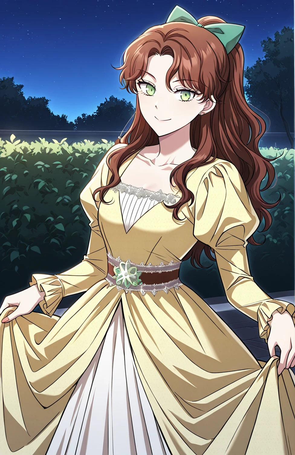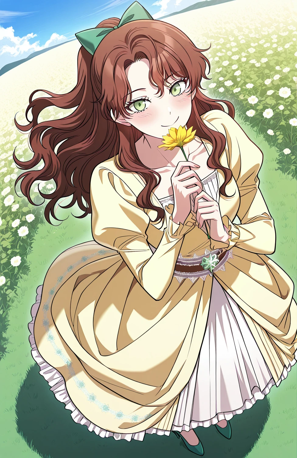 yellow dress, floral pattern, puffed sleeves, square neckline, ruffled cuffs, brown waistband, layered skirt, white underskirt, green hair bow, green shoes, high heels,