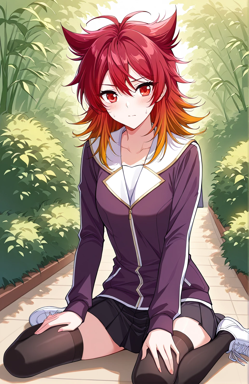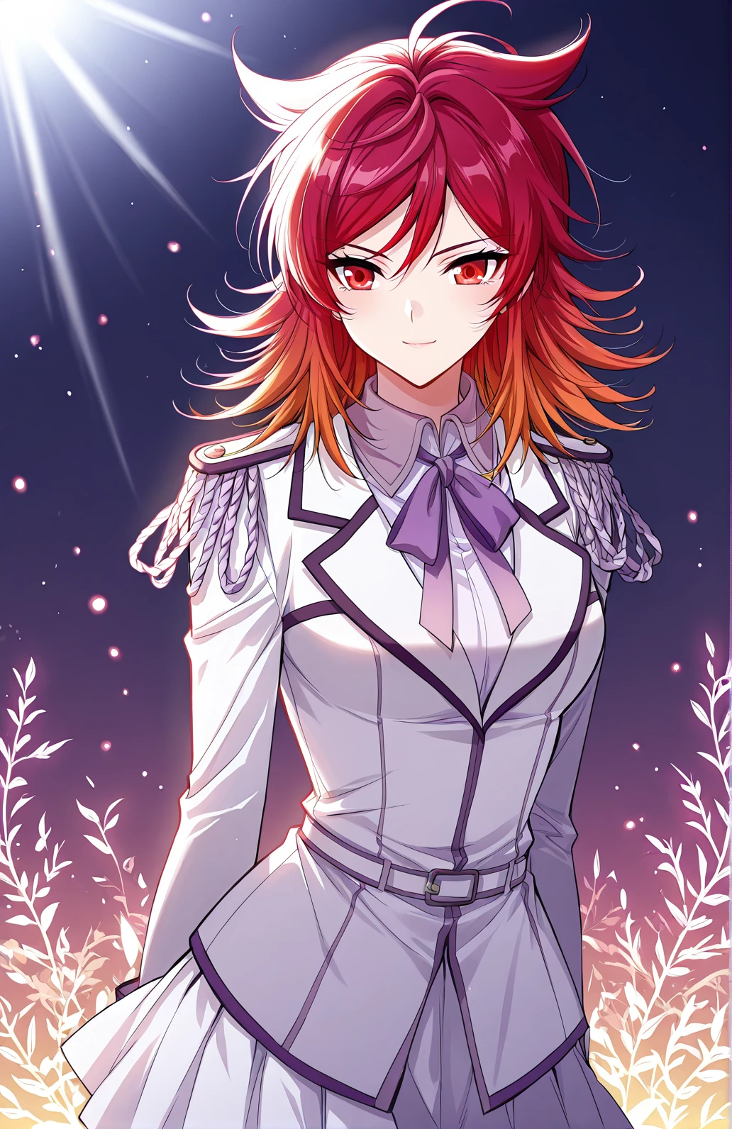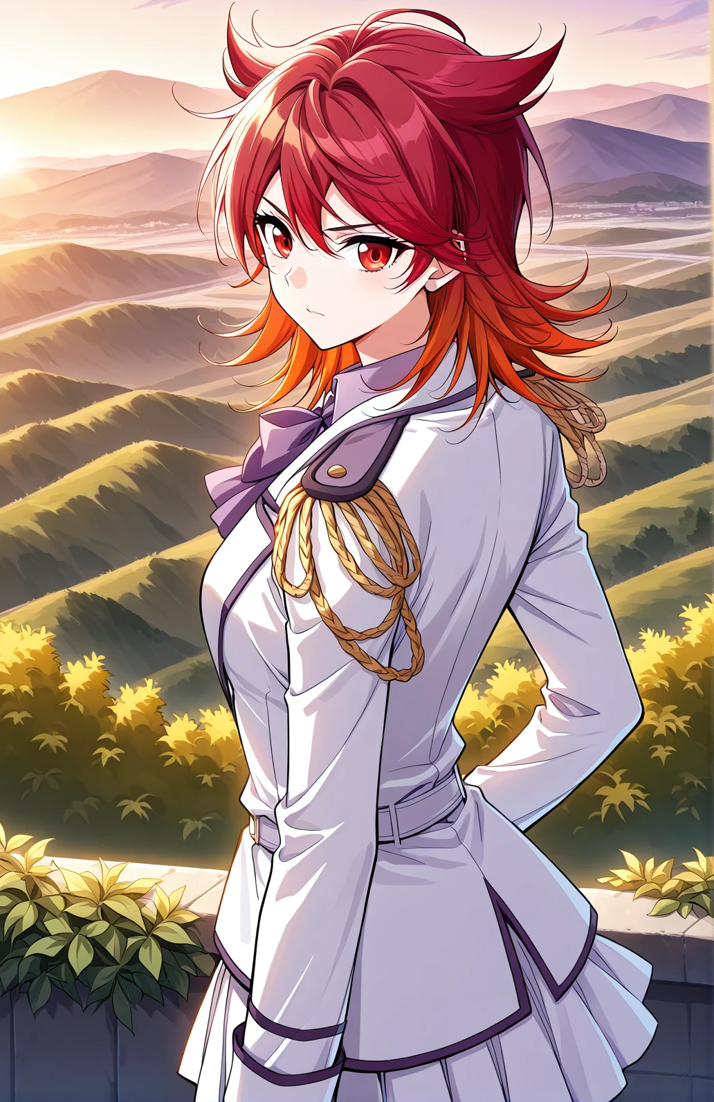 Feng, 1 girl, solo, red eyes, medium hair, red hair, layered hair, spiky hair tips, hair tufts, side bangs