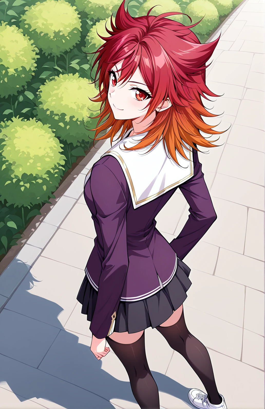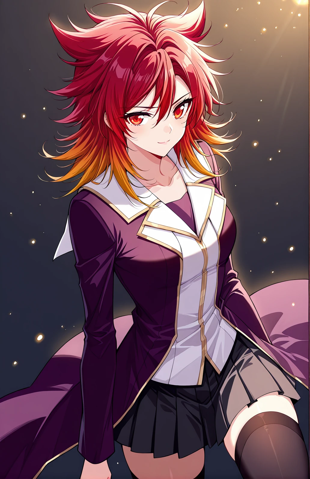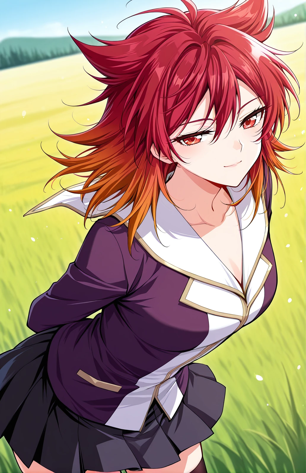 Feng, 1 girl, solo, red eyes, medium hair, red hair, layered hair, spiky hair tips, hair tufts, side bangs