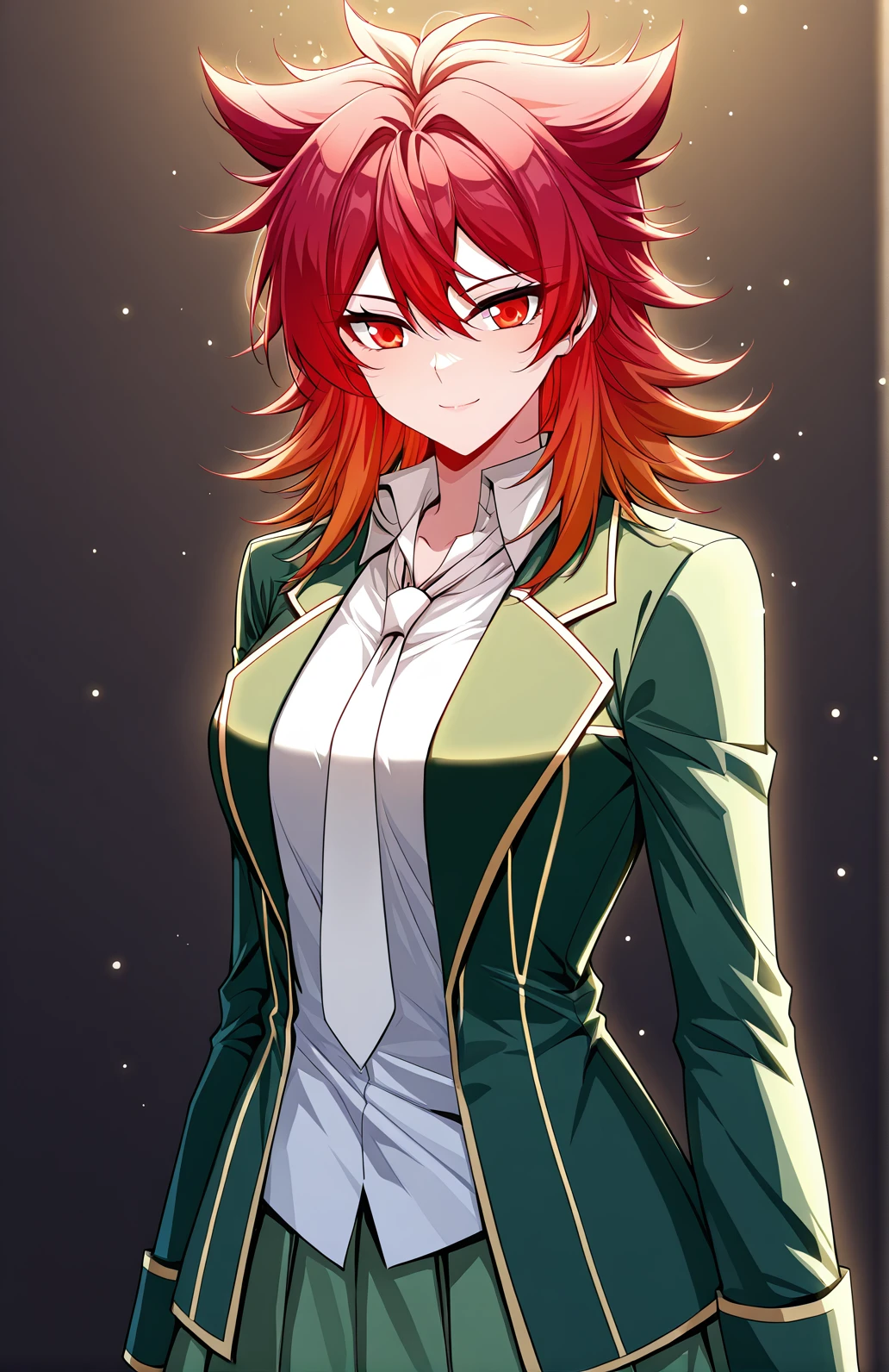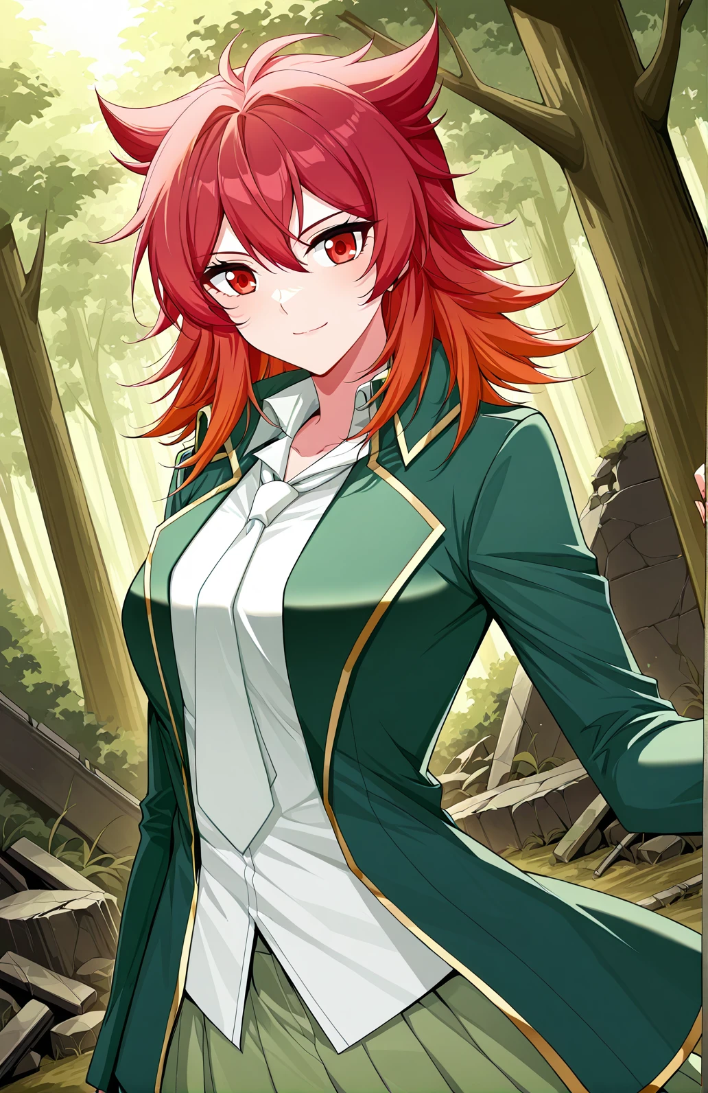 Feng_outfit3, green blazer, gold trim, white dress shirt, loose necktie, green pleated skirt, white undershirt,