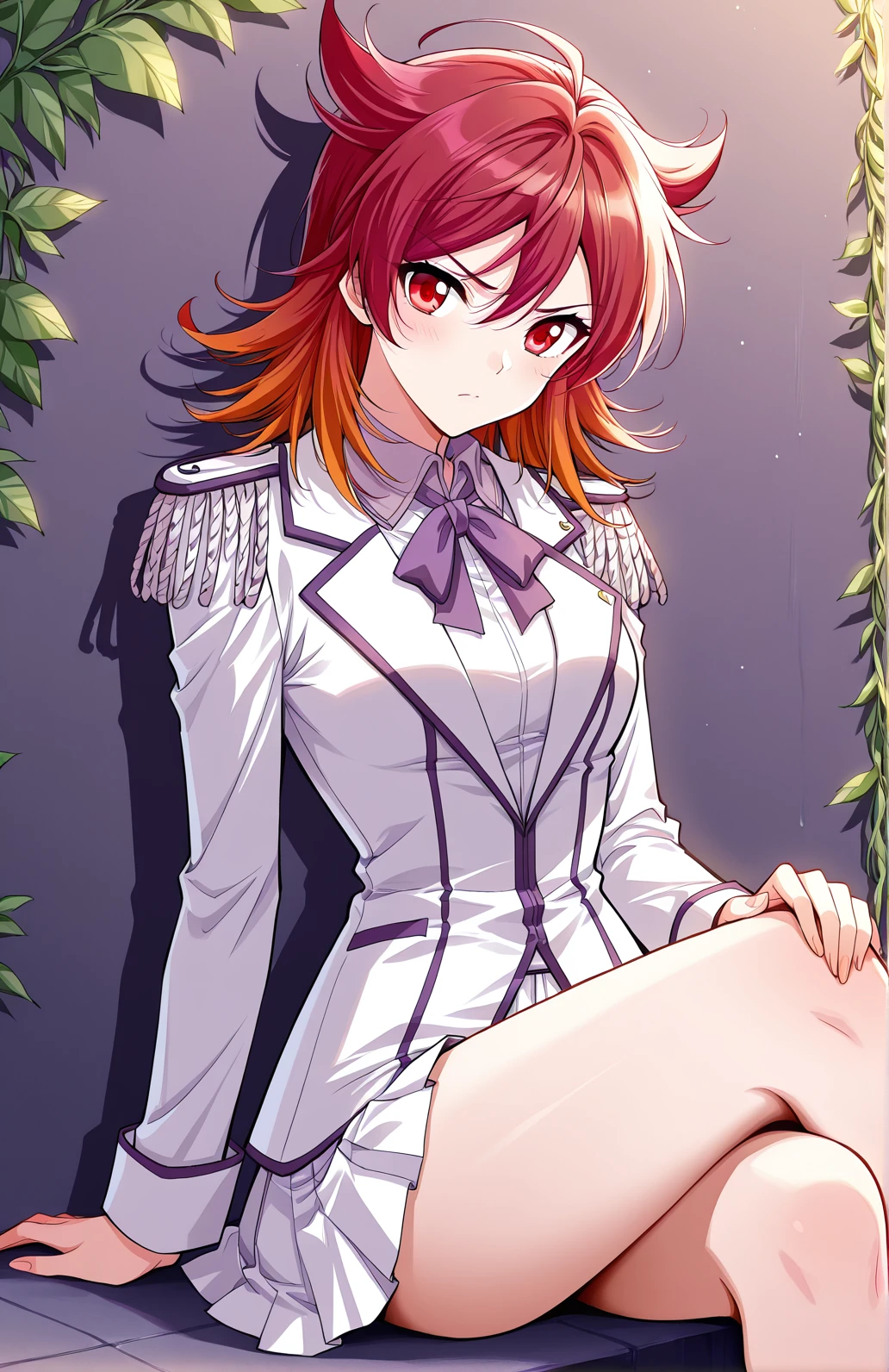 Feng_outfit2, white jacket, fitted jacket, purple accents, lapel collar, purple bowtie, shoulder epaulets, ornamental chains, pleated skirt, short skirt, white skirt, white shirt, long sleeves