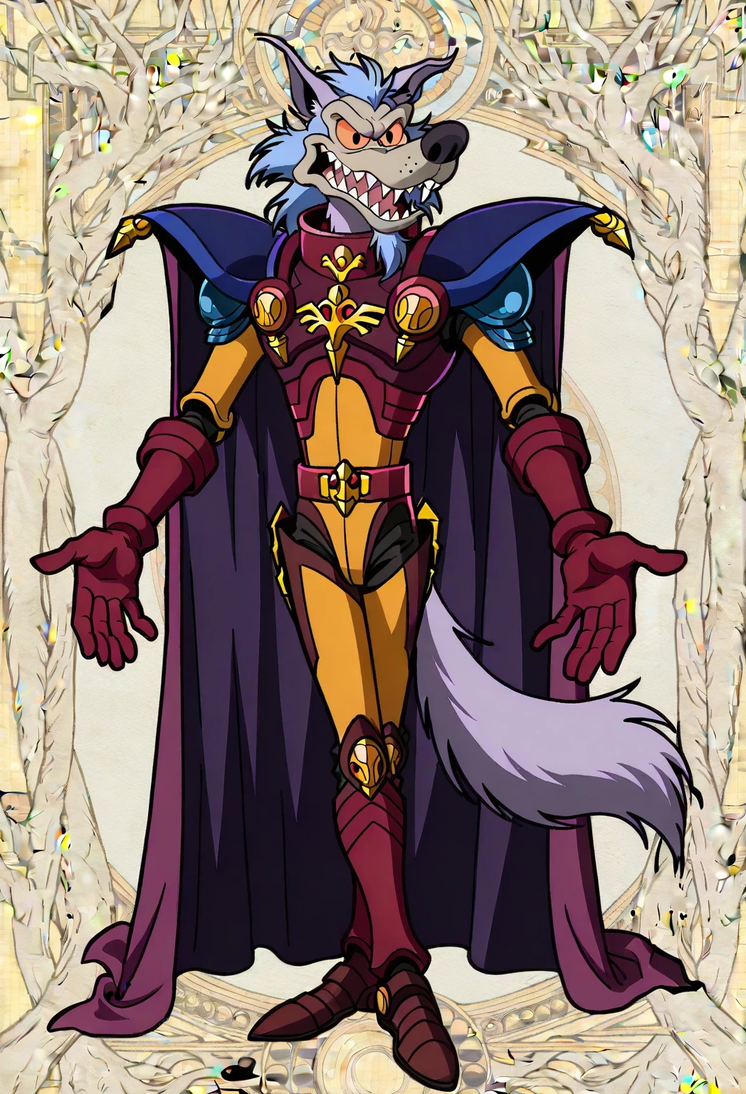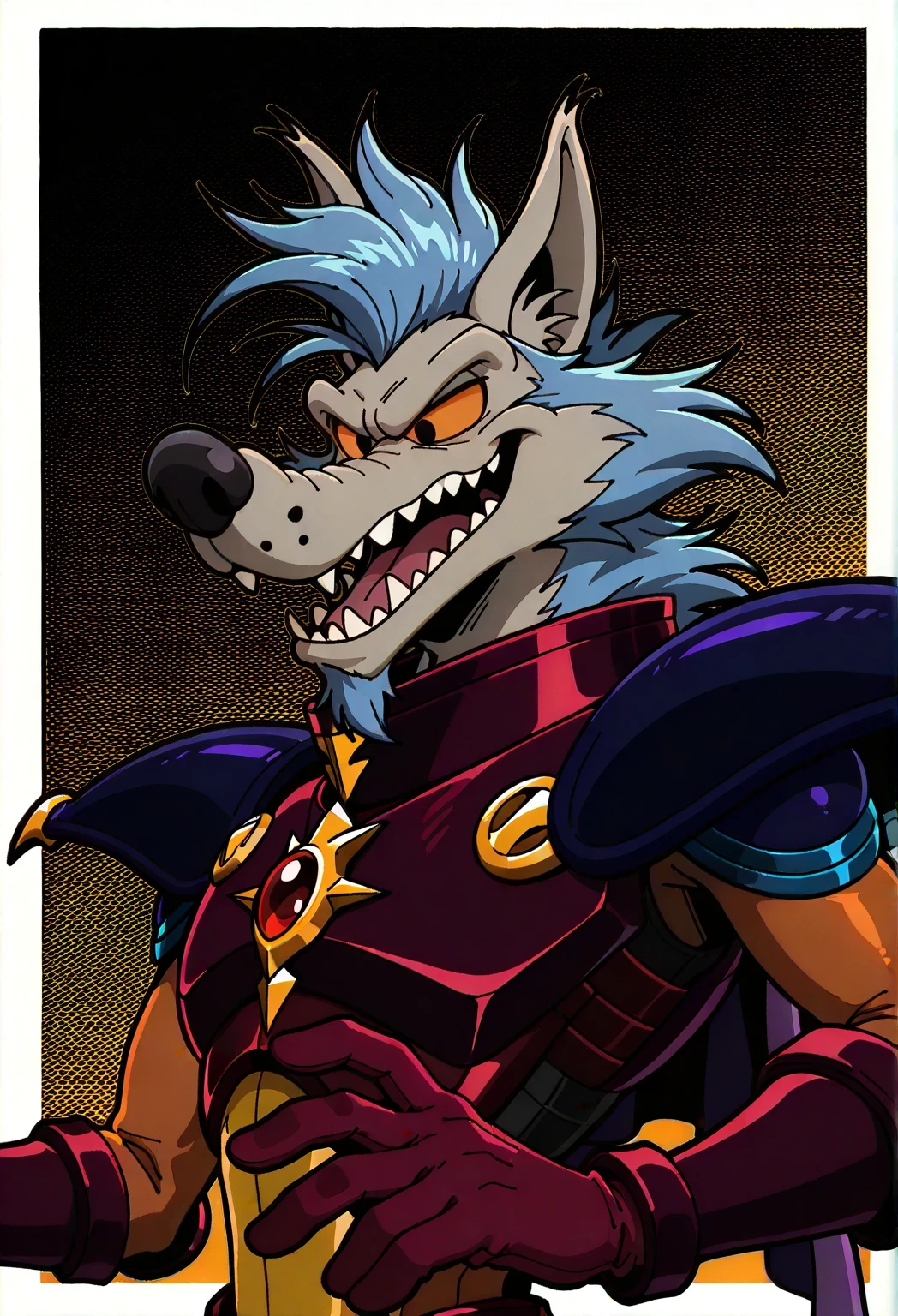 SleetSU, 1boy, tall,wolf, red gold purple armored outfit, regal purple cape, red gloves, red boots, blue shoulder pads, blue hair, black eyes, orange sclera, sharp teeth