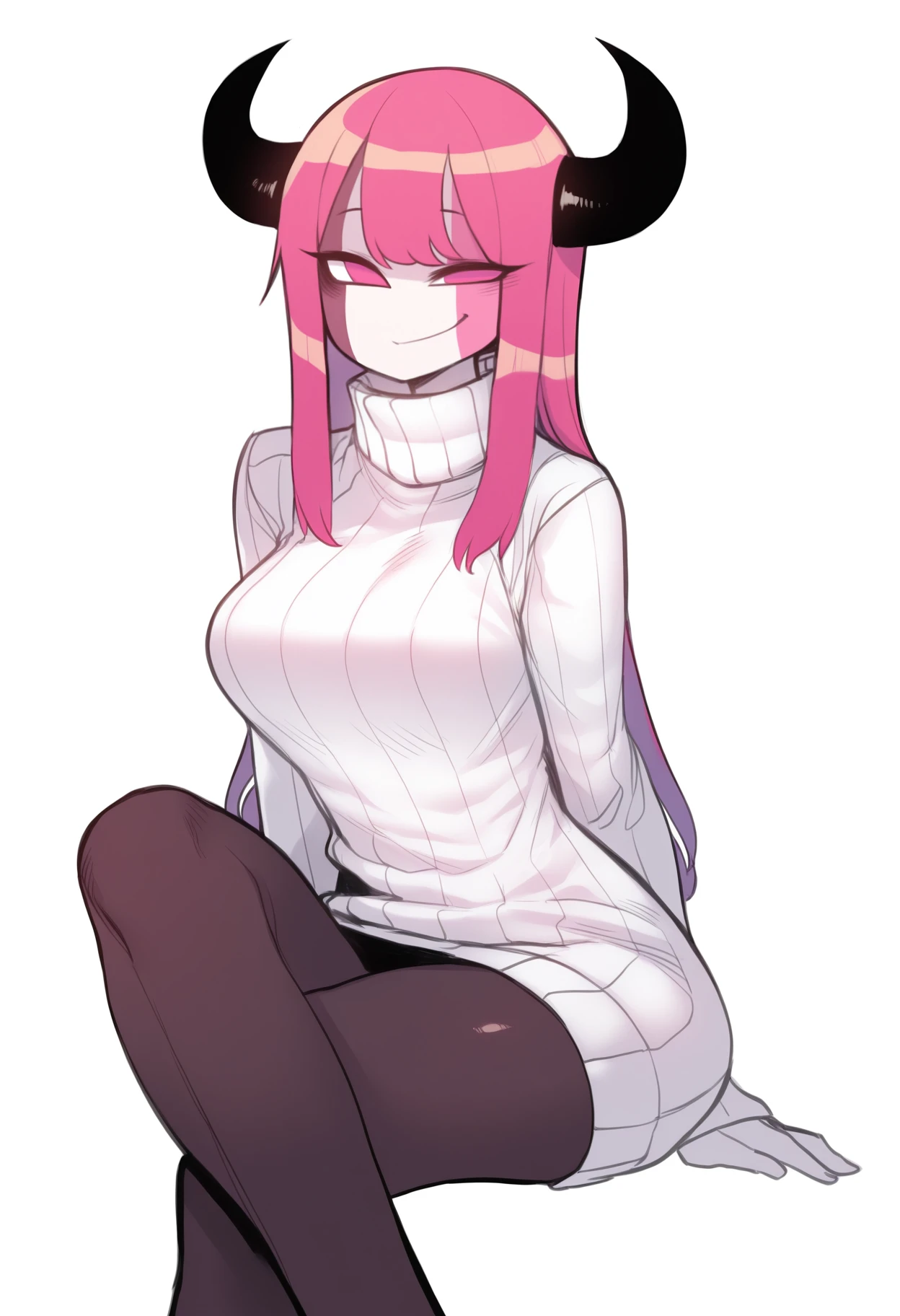 sarvente, colored skin, demon wings, habit, demon horns, pink eyes, no pupils, black leotard, heart cutout, black gloves, elbow gloves, black thighhighs