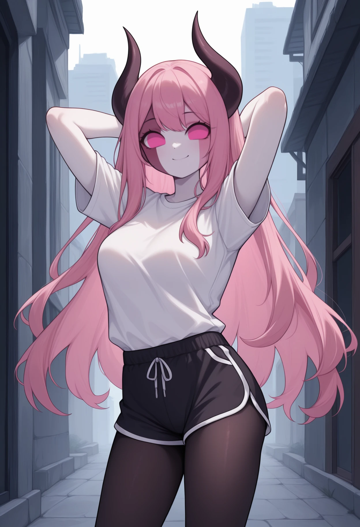 Gospel: demon wings, habit, demon horns, pink eyes, no pupils, black leotard, heart cutout, black gloves, elbow gloves, black thighhighs