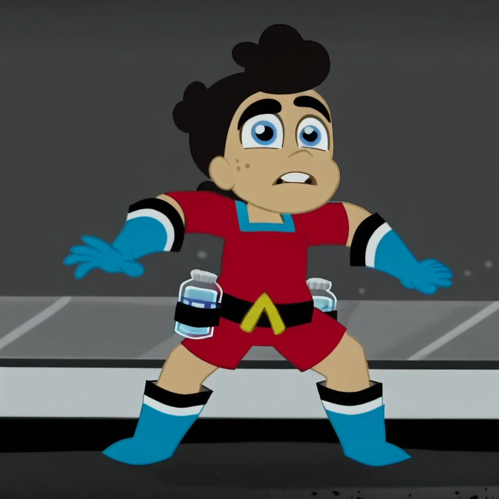 Superhero: garth, solo, 1boy, plump, short, black hair, hair buns, freckles, blue eyes, red shirt with blue collar, blue pants, superhero costume, blue gloves with black and white stipes, blue boots with black and white stripes, black belt with yellow logo, bottle of water