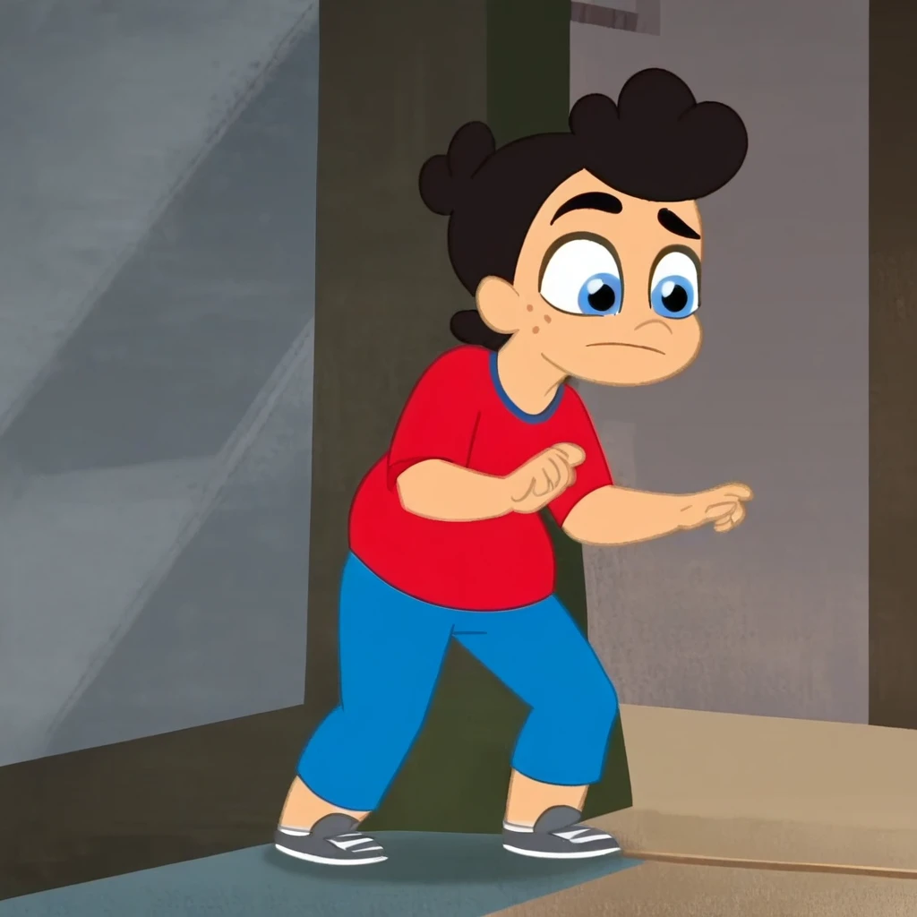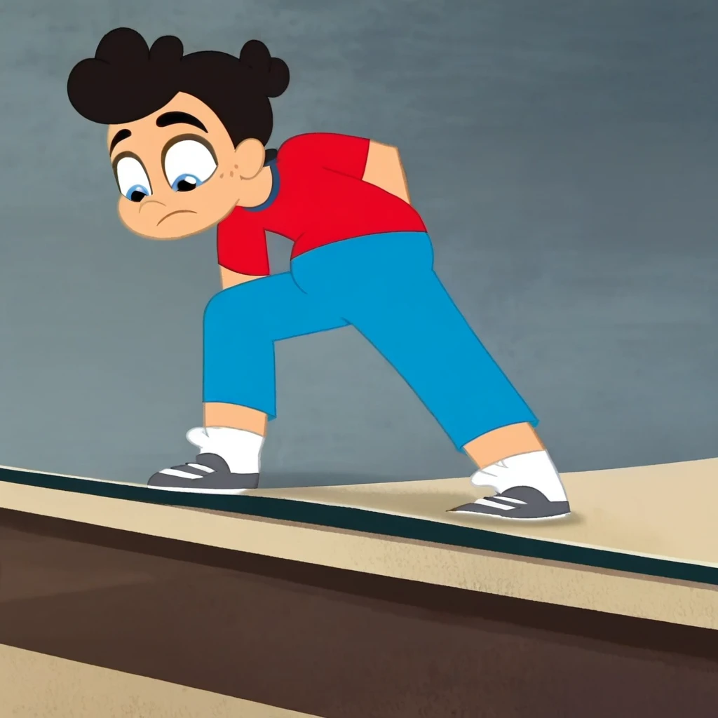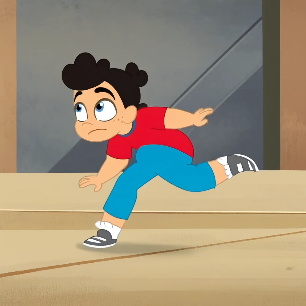 Casual: garth, solo, 1boy, plump, short, black hair, hair buns, freckles, blue eyes, red shirt with blue collar, blue pants, grey shoes