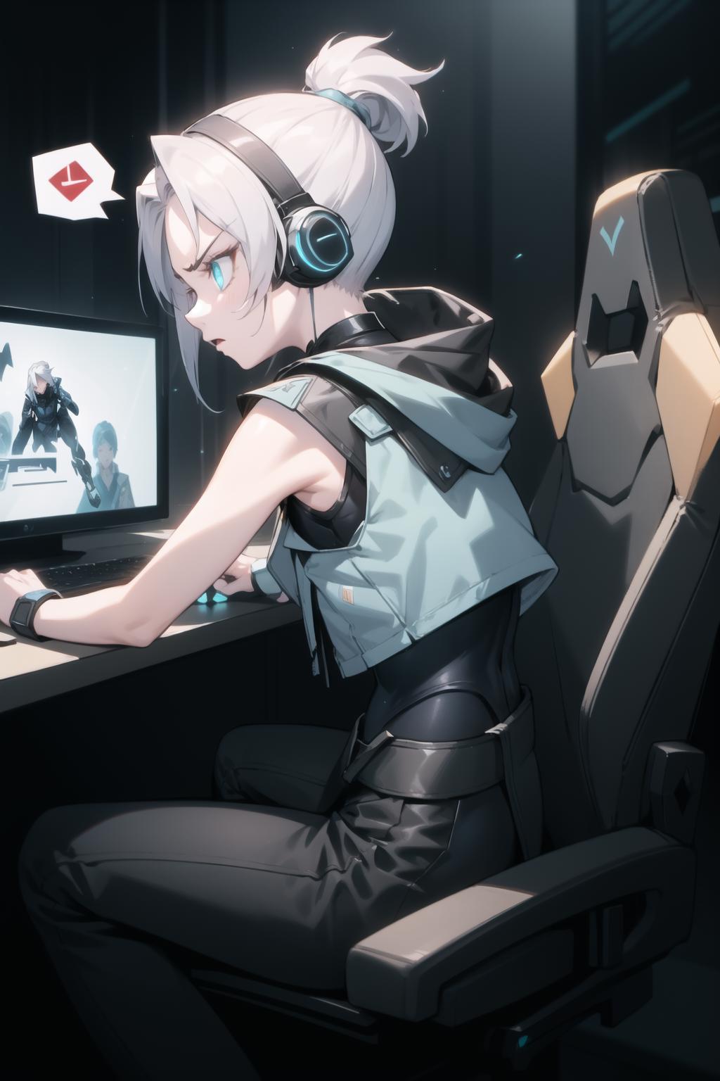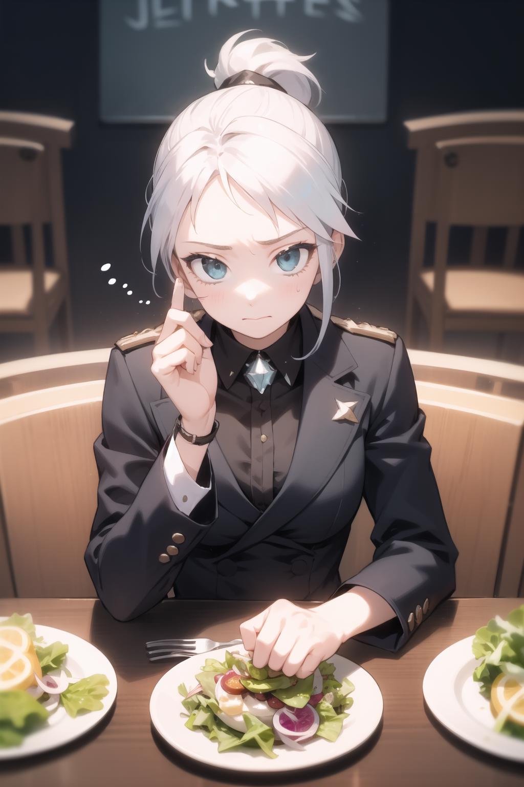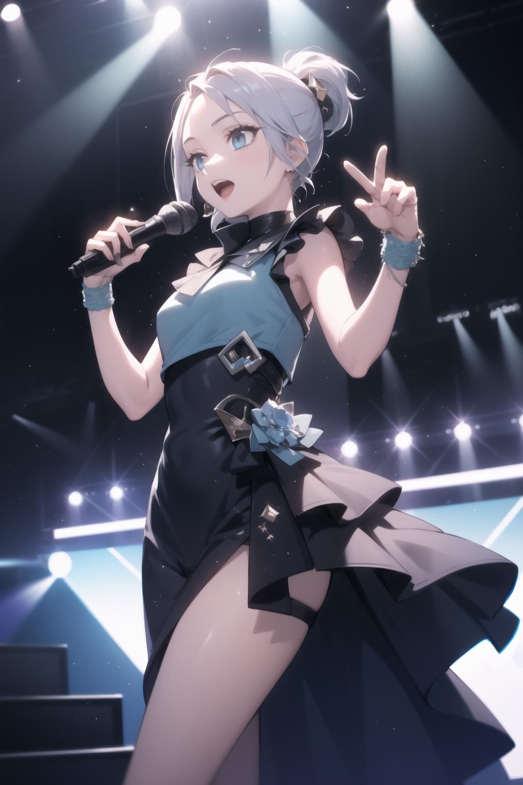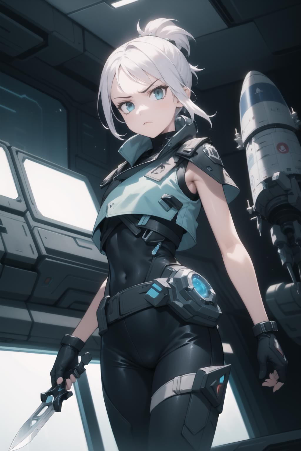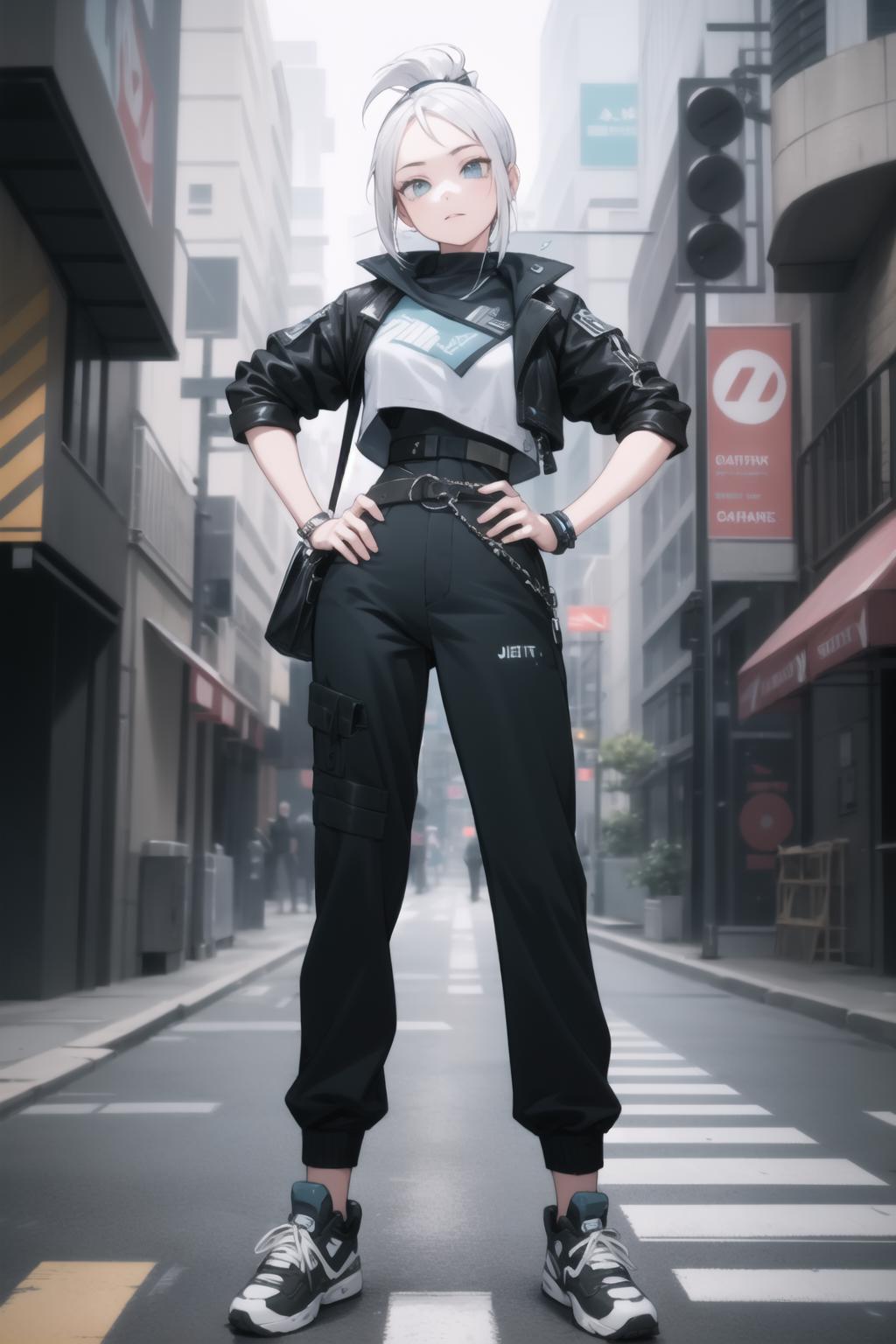 blue cropped jacket, sleeveless, black bodysuit, black pants