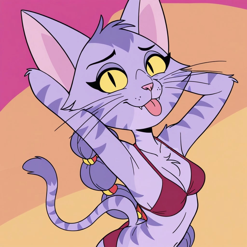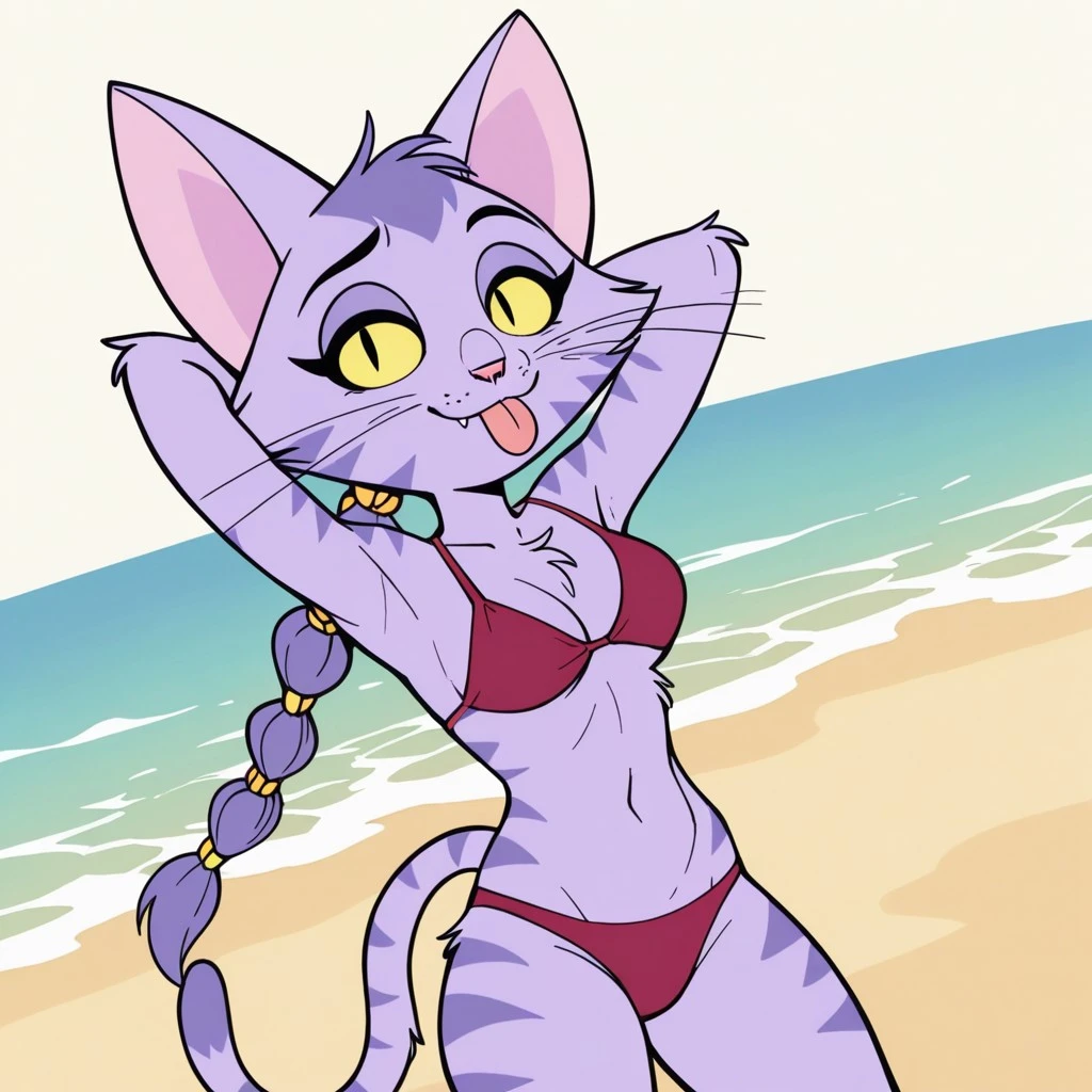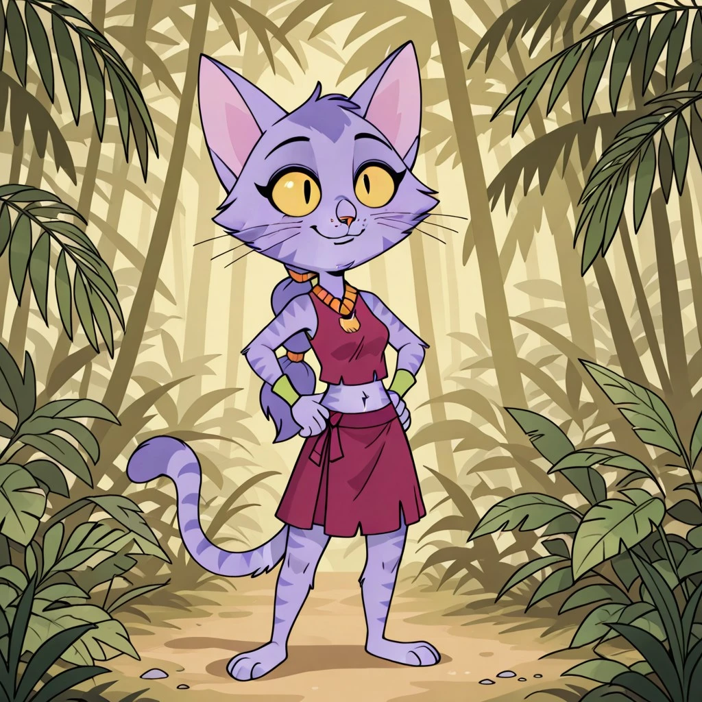 cat, cat girl, purple fur, striped fur, long ponytail, yellow hair ties, yellow eyes, slit pupils, pink cat nose, whiskers, cat ears, fluffy cat tail, maroon top, orange and yellow necklace, green wrist bands, maroon skirt,
