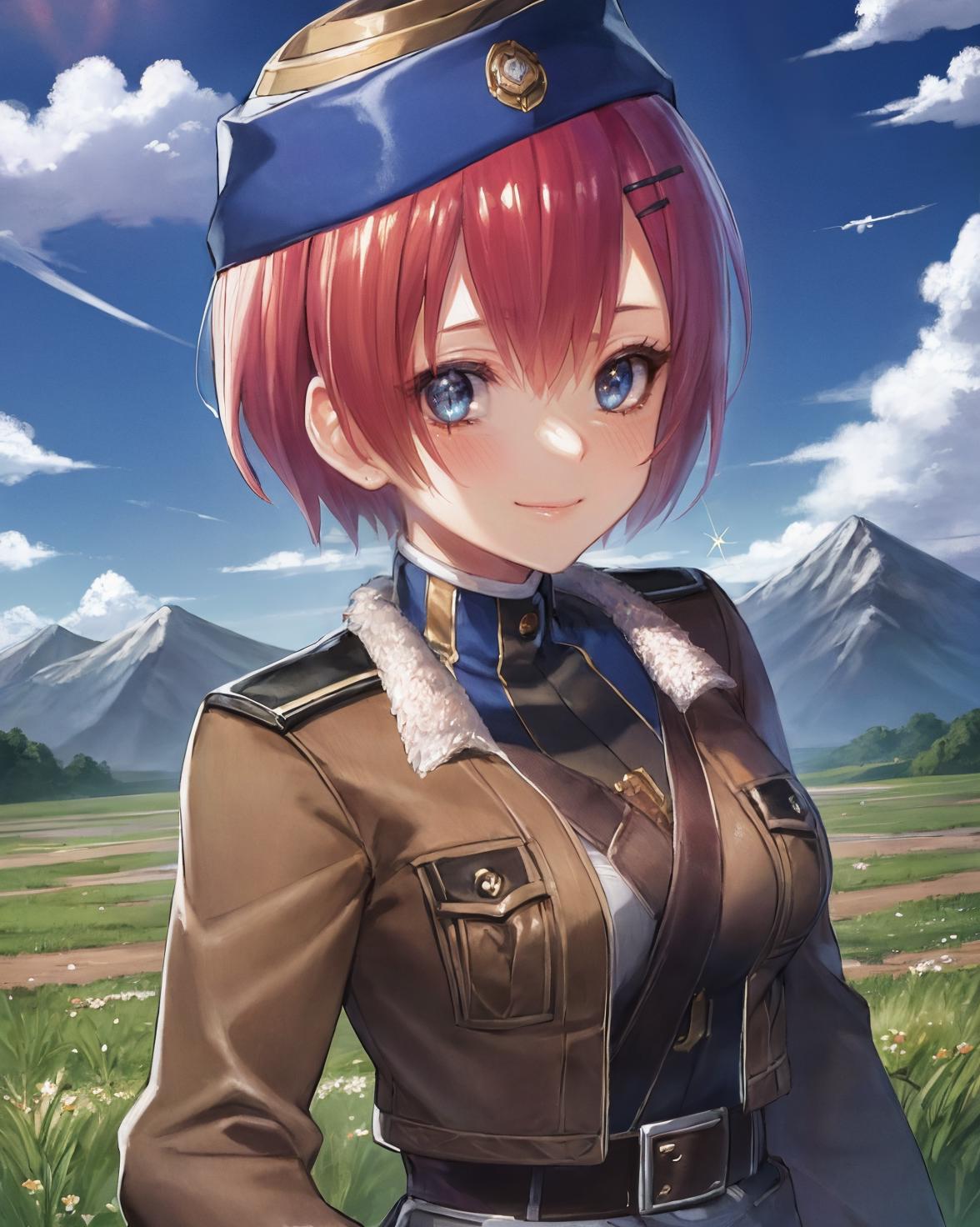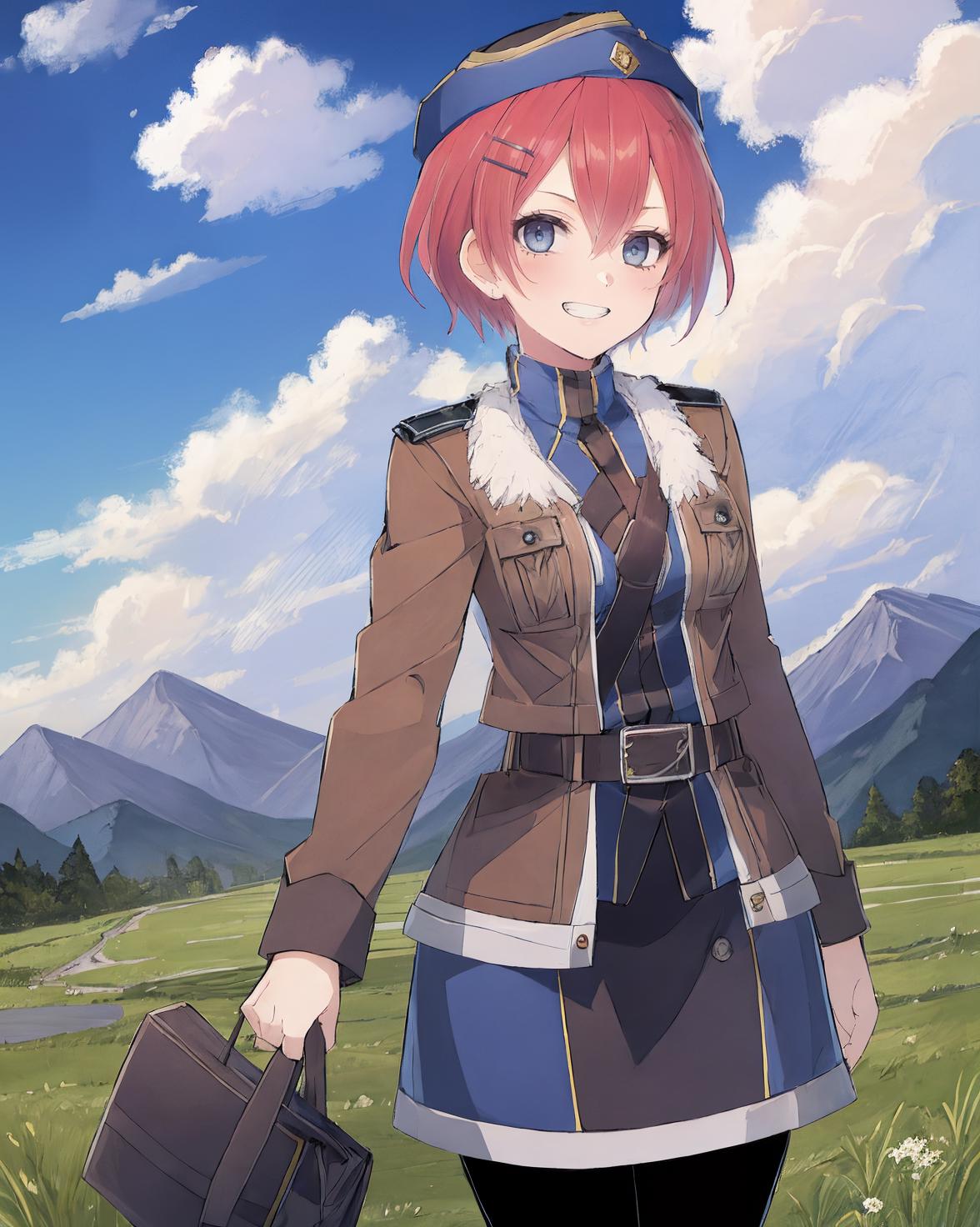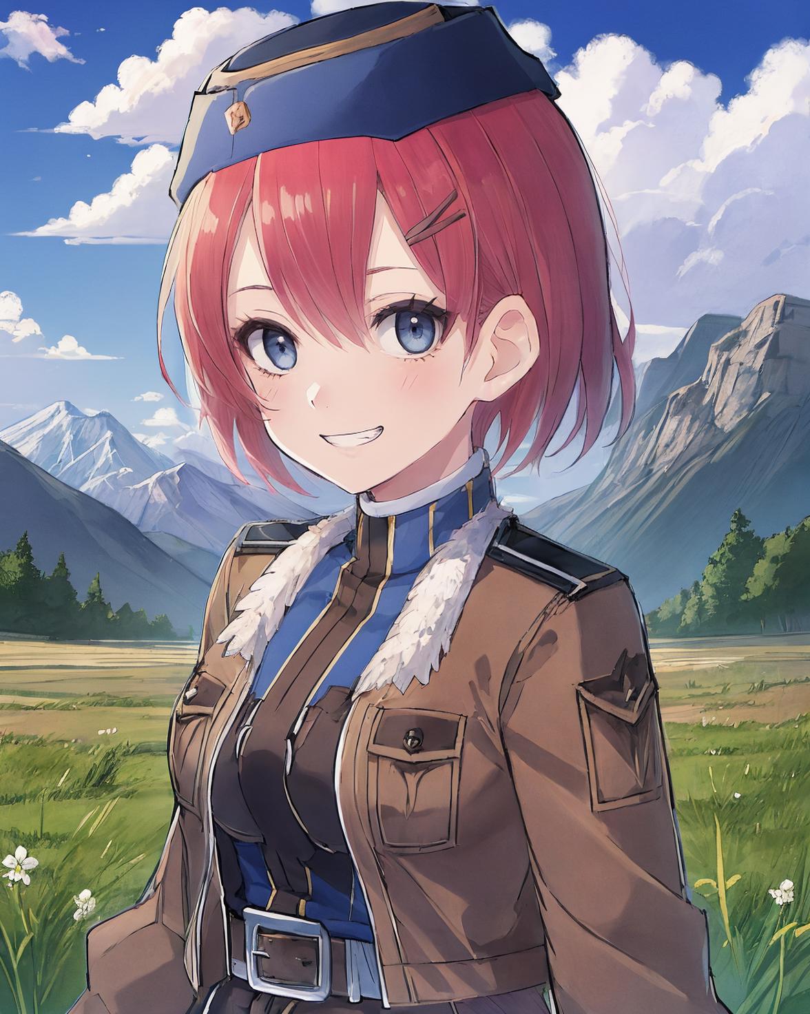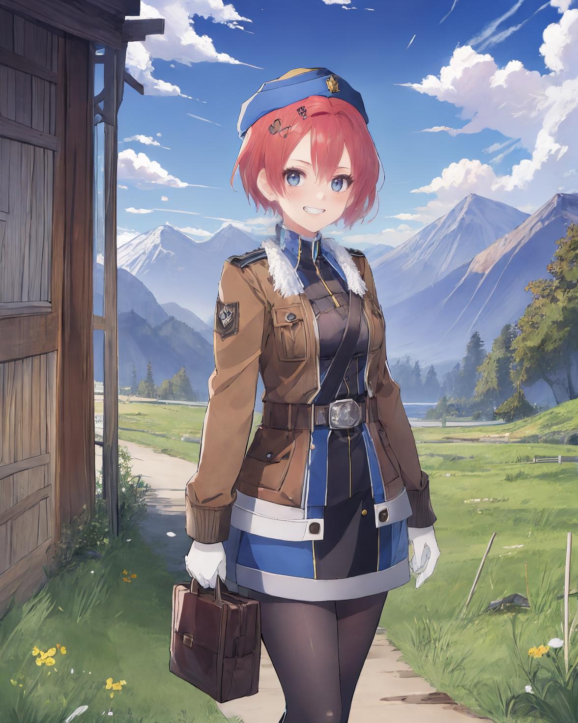 garrison cap, brown jacket, blue military uniform, brown belt, blue skirt, black pantyhose, black boots, white gloves,Description
