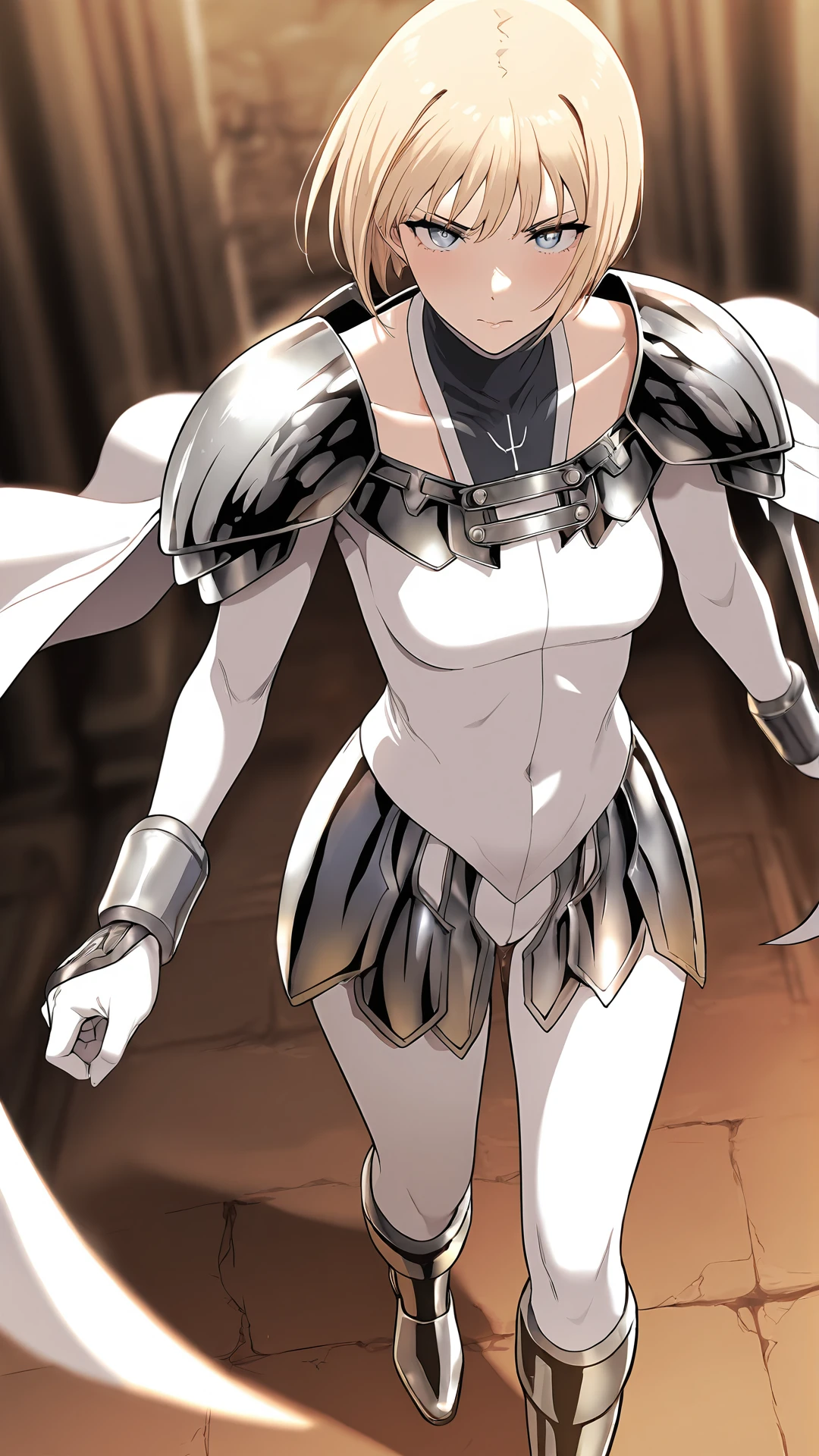 claymoreClare,1girl,solo,armor,cape,short hair,blonde hair,boots,gloves,