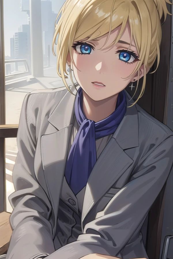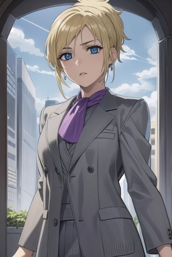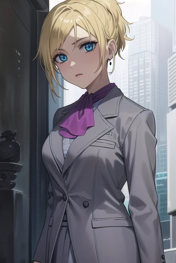 earrings, ascot, formal, suit, lipstick, makeup, jacket, (grey jacket:1.5),