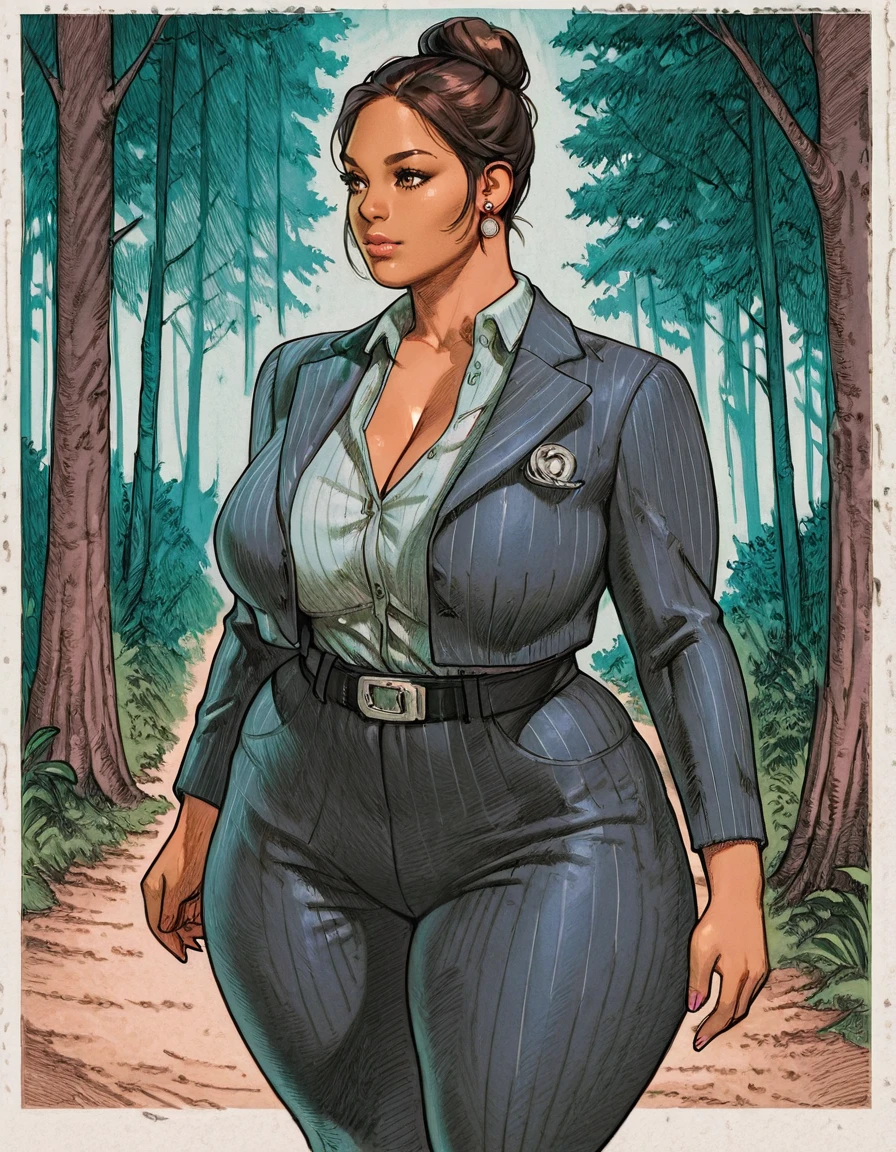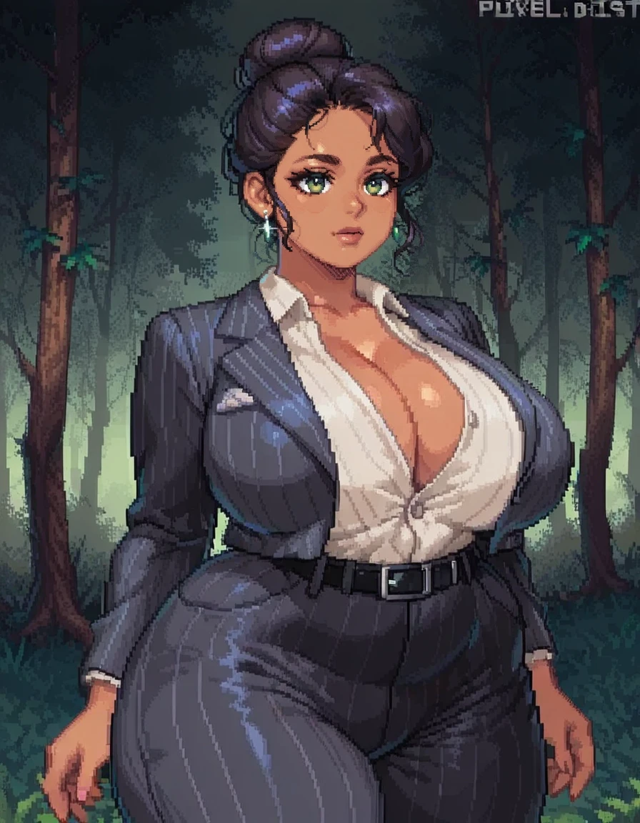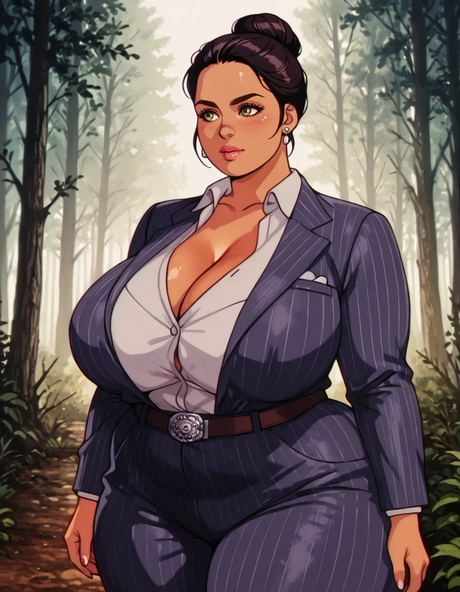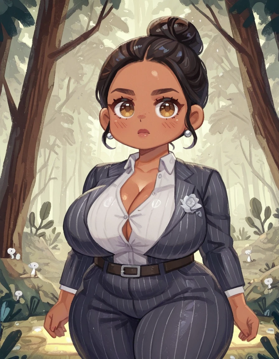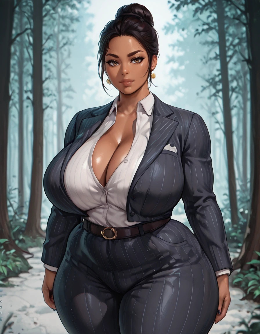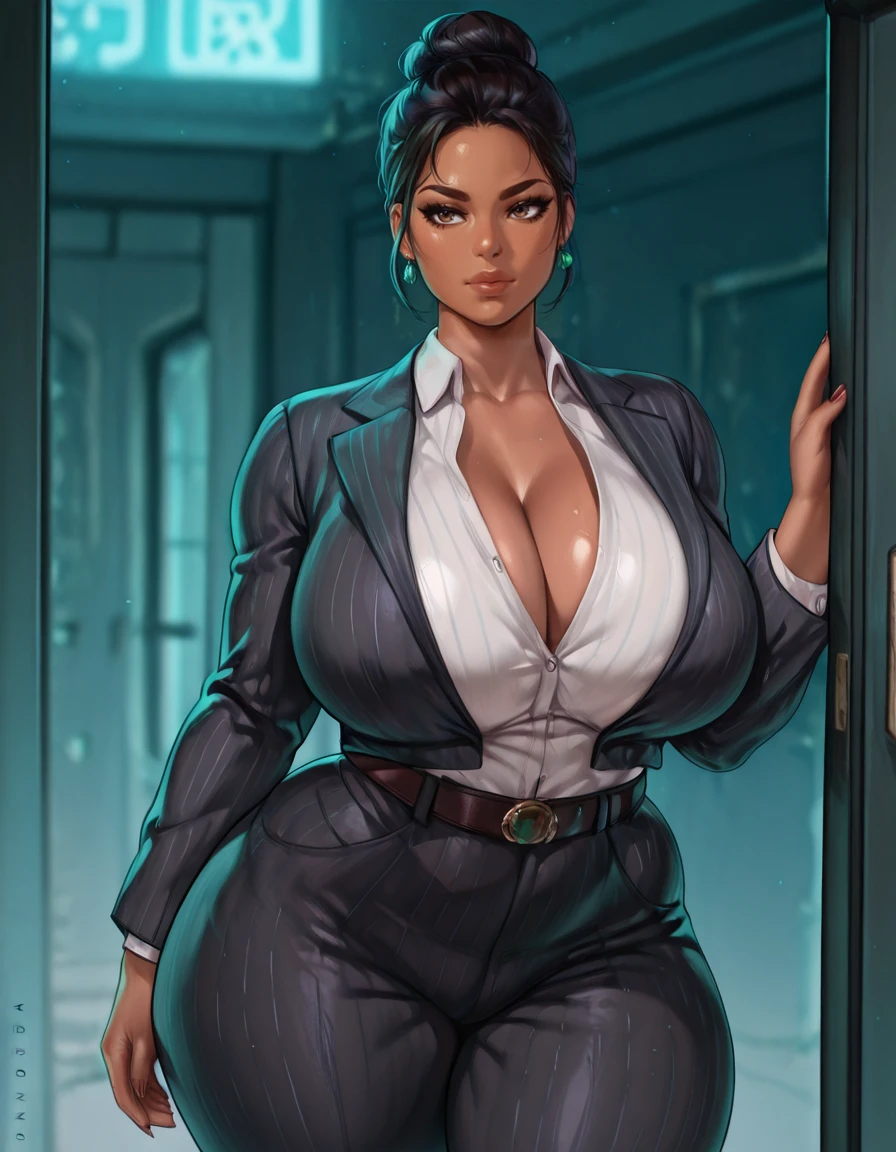 1girl, single hair bun, hair bun, solo, jewelry, formal, suit, belt, pants, pinstripe pattern, curvy, shirt, cleavage, striped, earrings, thick thighs, dark skin, jane romero,
