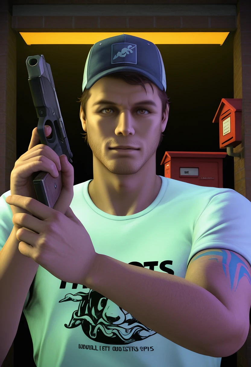 Ellis_L4D2, digital painting, semi-realistic, painterly style, rough brush strokes, muted colors, concept art, gritty atmosphere, male focus, holding weapon, cinematic lighting, comic art style, western artstyle,1boy, weapon, shirt, hat, male focus,