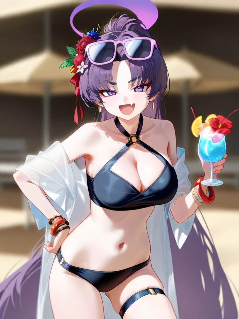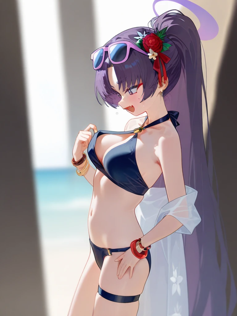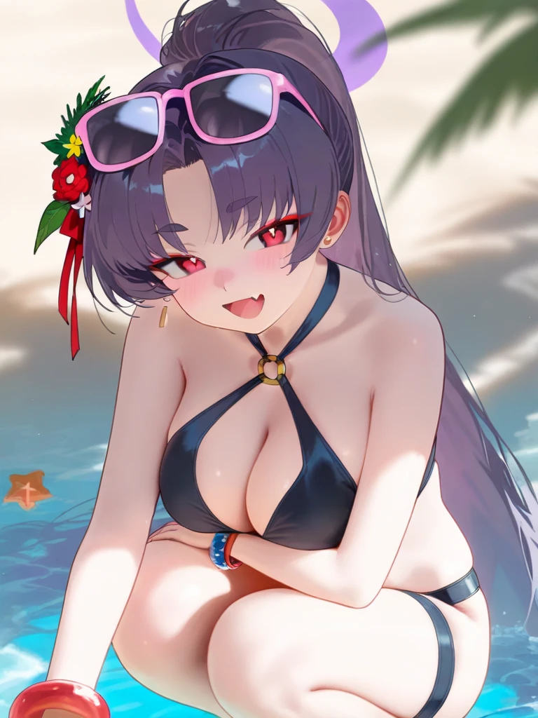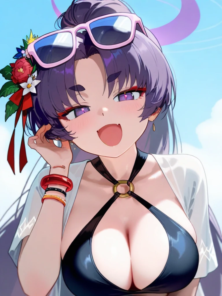 yukari (blue archive), 1girl, soloyukari (blue archive),1girl,solo,skin fang,purple eyes,eyewear on head,long hair,official alternate hairstyle,purple hair,parted bangs,ponytail,thigh strap,official alternate costume,halterneck,red flower,,训练模型:ILL V0.1
