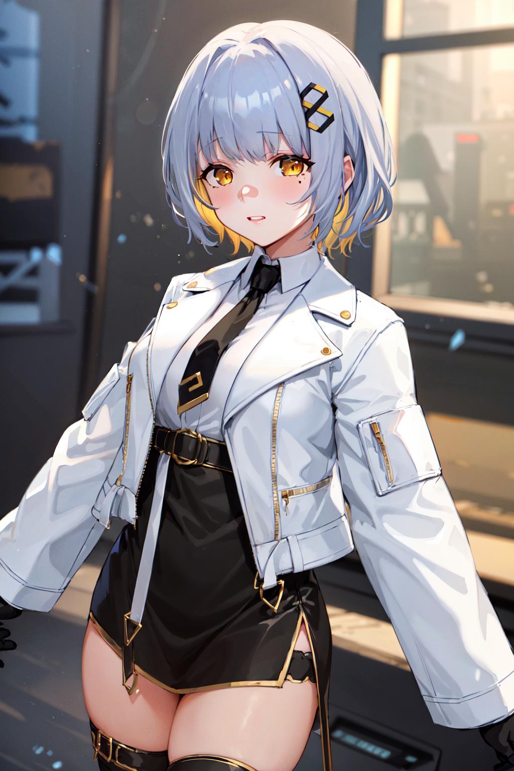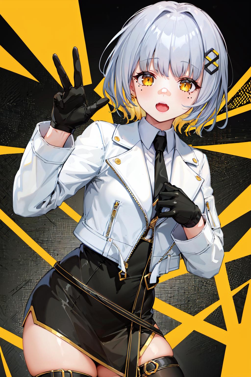 hachi_(vtuber), 1girl, gloves, blonde hair, black gloves, necktie, white jacket, short hair, hair ornament, cropped jacket, multicolored hair, yellow eyes, long sleeves, thighhighs, black necktie, grey hair, black skirt, mole under eye