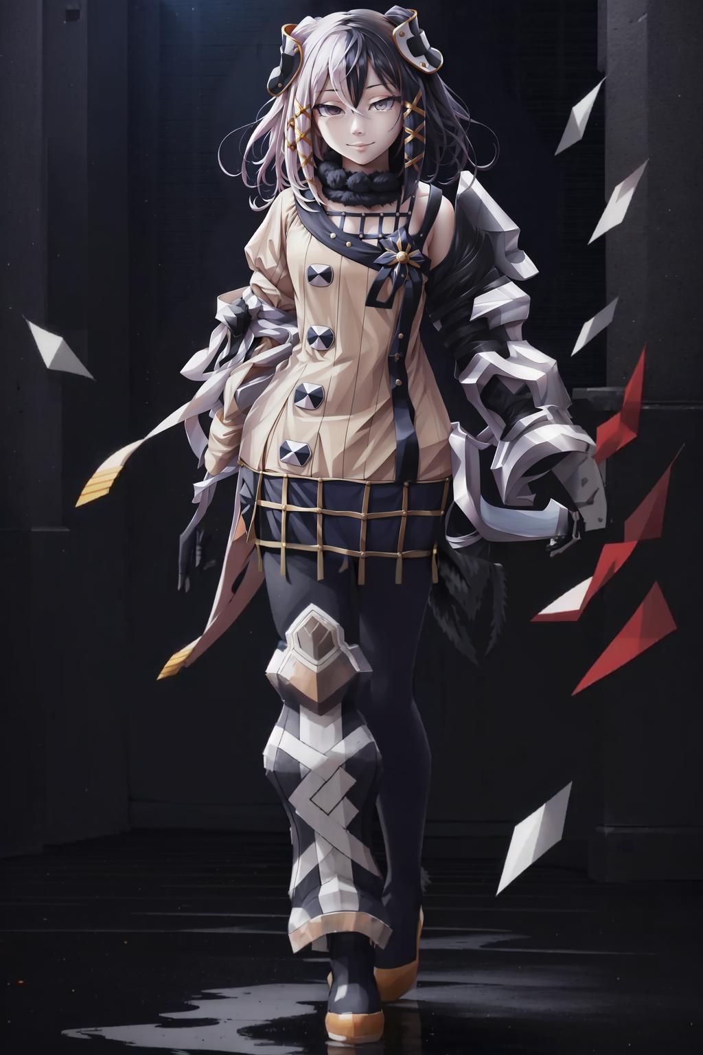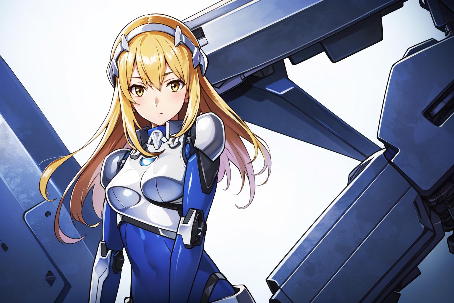 To summon her use the trigger Tags plus following tags: solo, long hair, blue footwear, blonde hair, armor, yellow eyes, very long hair, thighhighs, breastplate, gloves, thigh boots, white dress, hair between eyes, zettai ryouiki, shoulder armor,